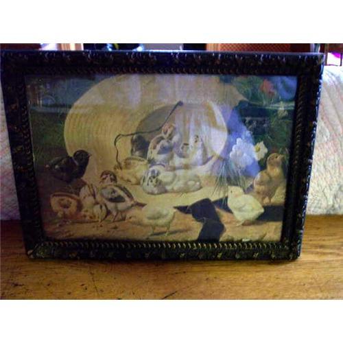 Darling print of baby chicks in an old straw hat.Very nice colors.In old frame that has a few chips and wear spots.Measures 14 1/2 x10 1/2.
