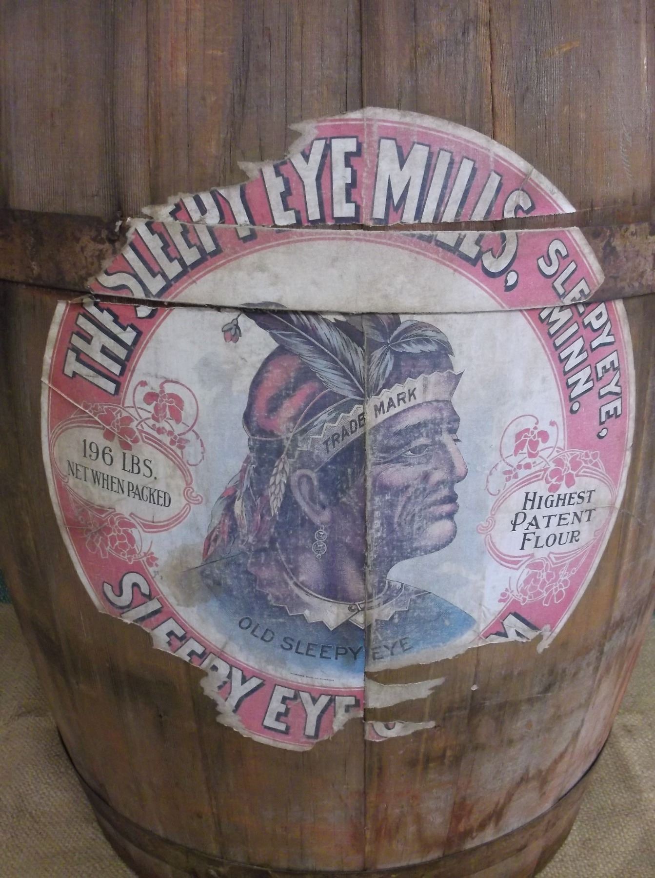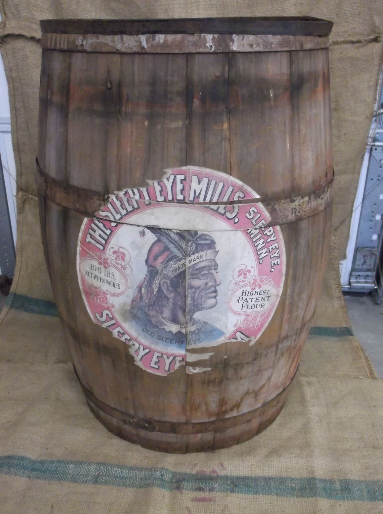 Old Barrel With The Sleepy Eye Mills Advertisement Decal- 34"H X 22"W