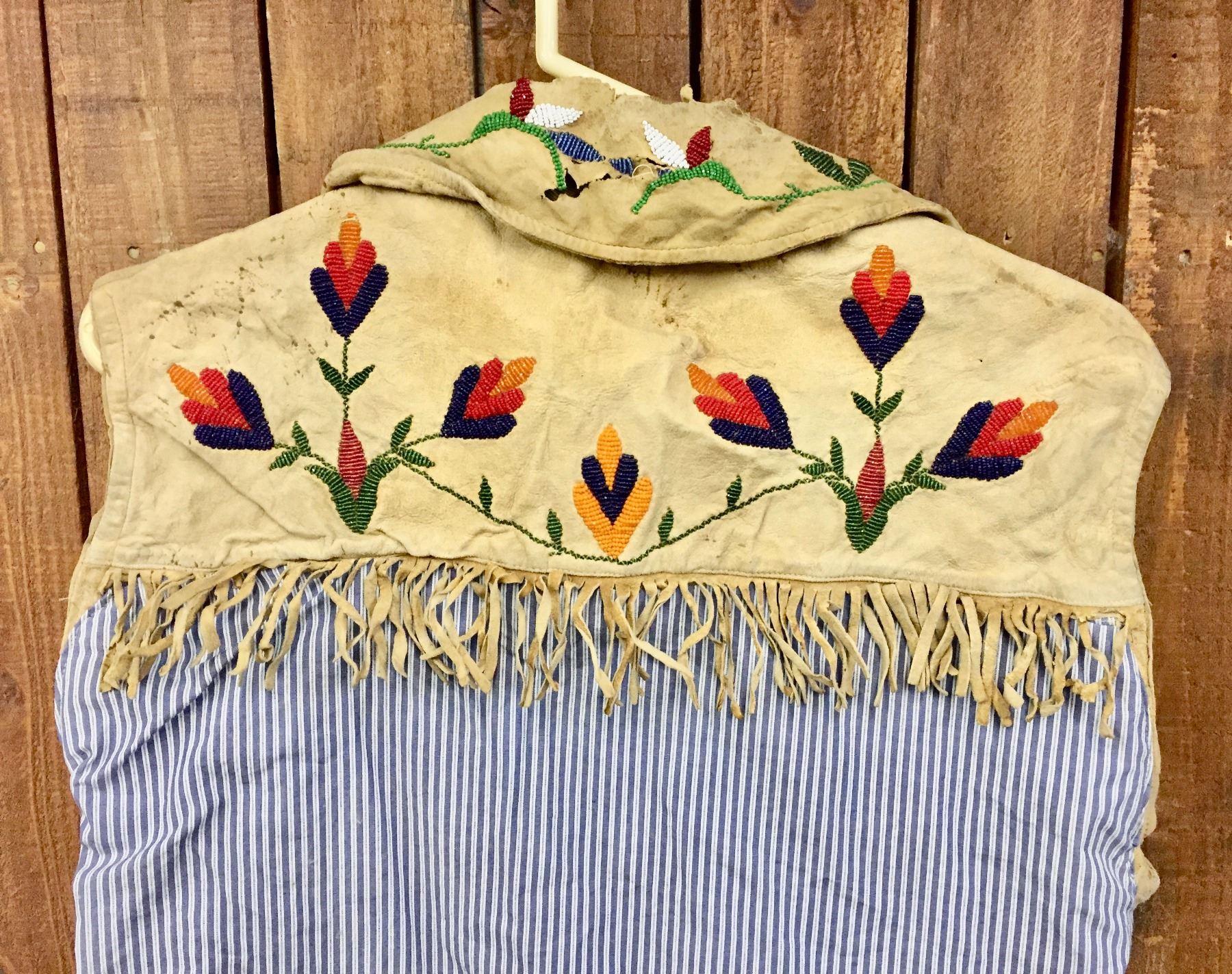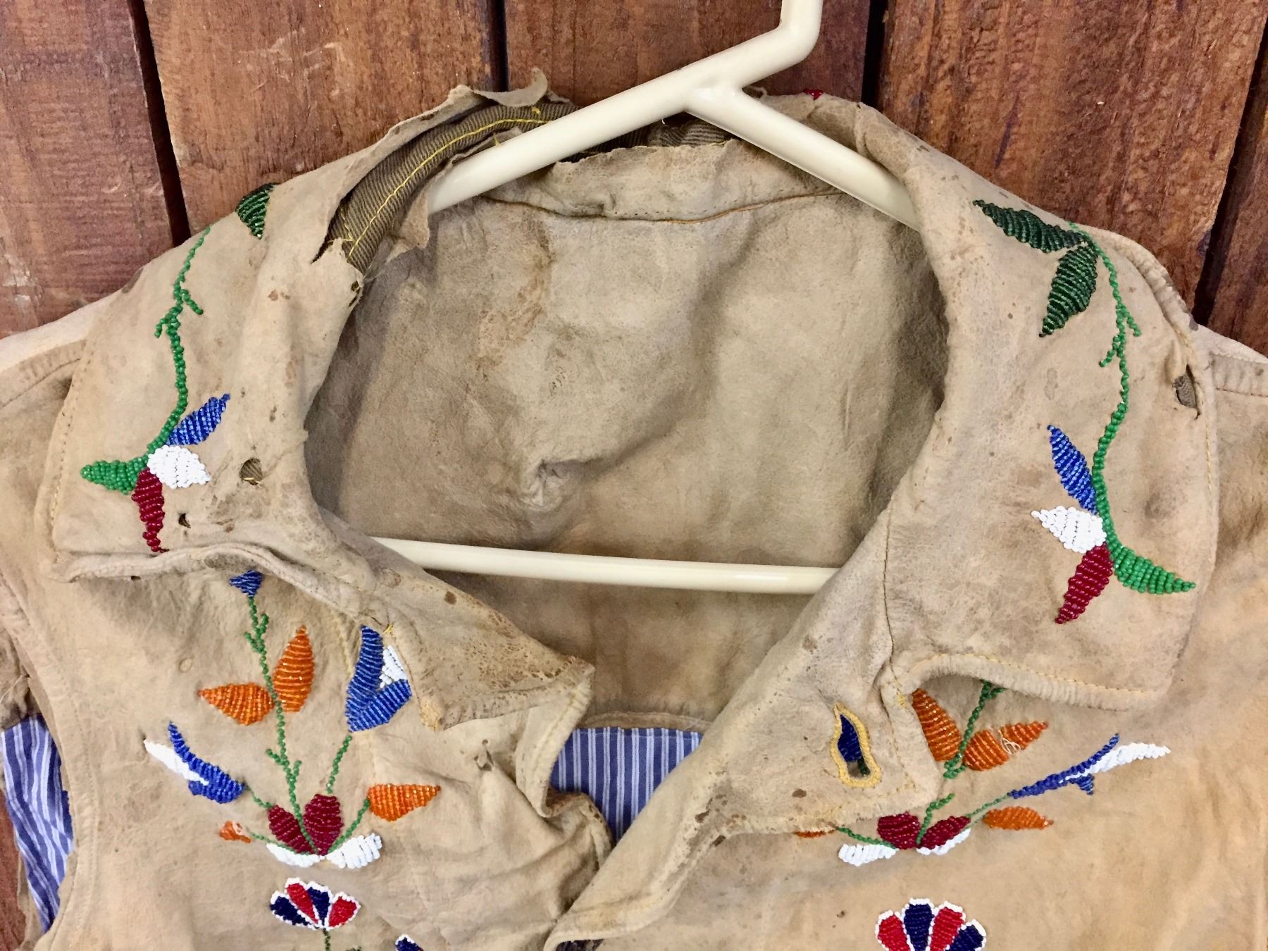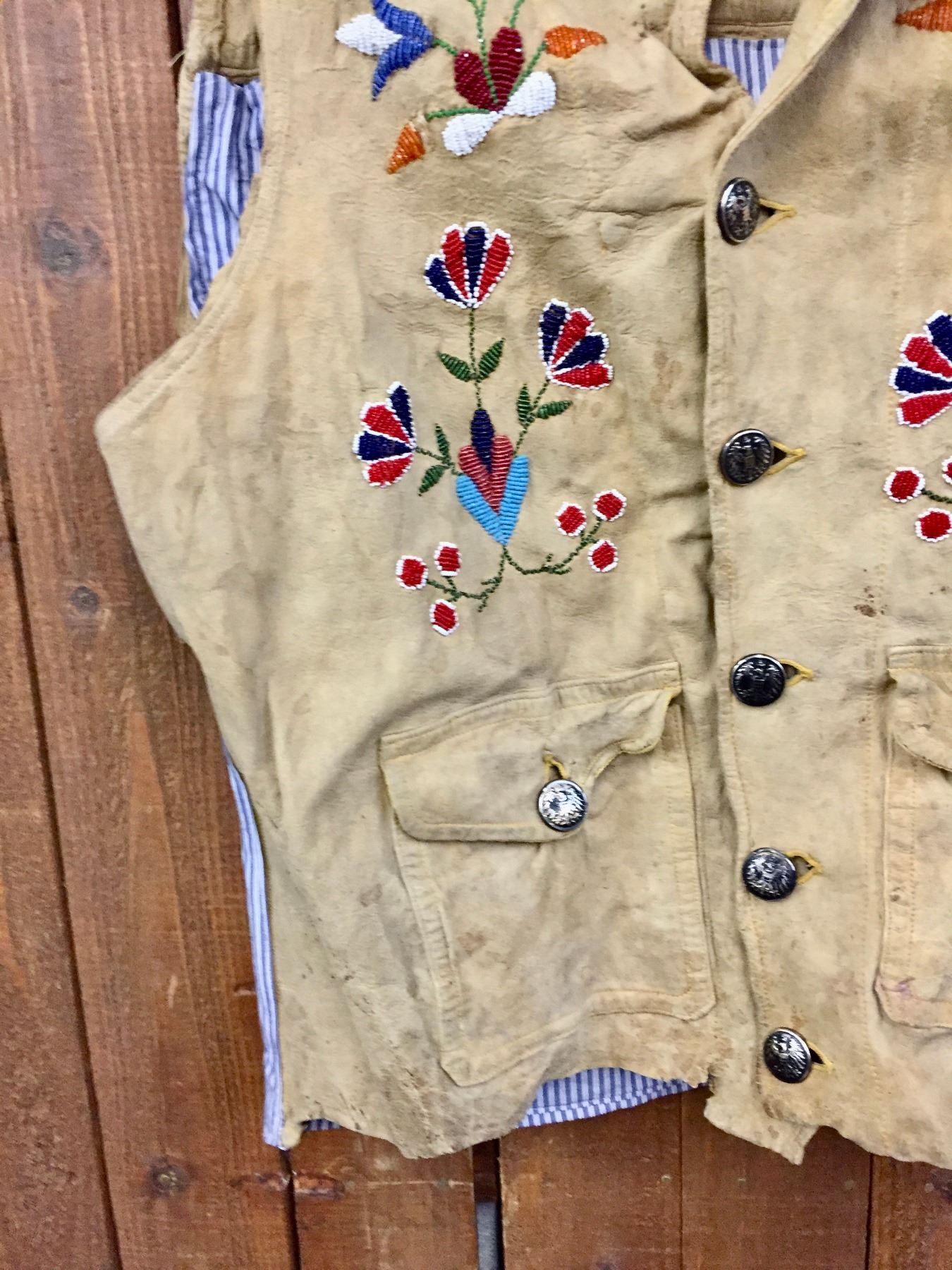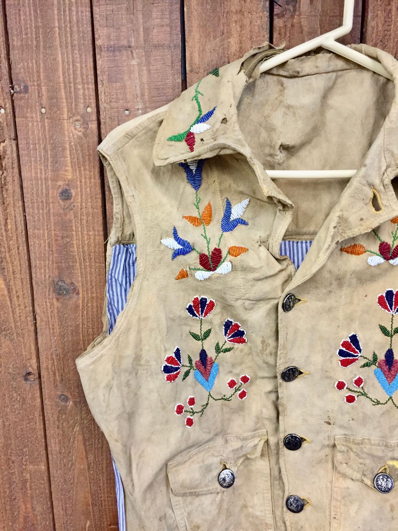 Description: Presented for sale in this lot is an old, hand crafted leather vest featuring intricate beading and highly detailed buttons.