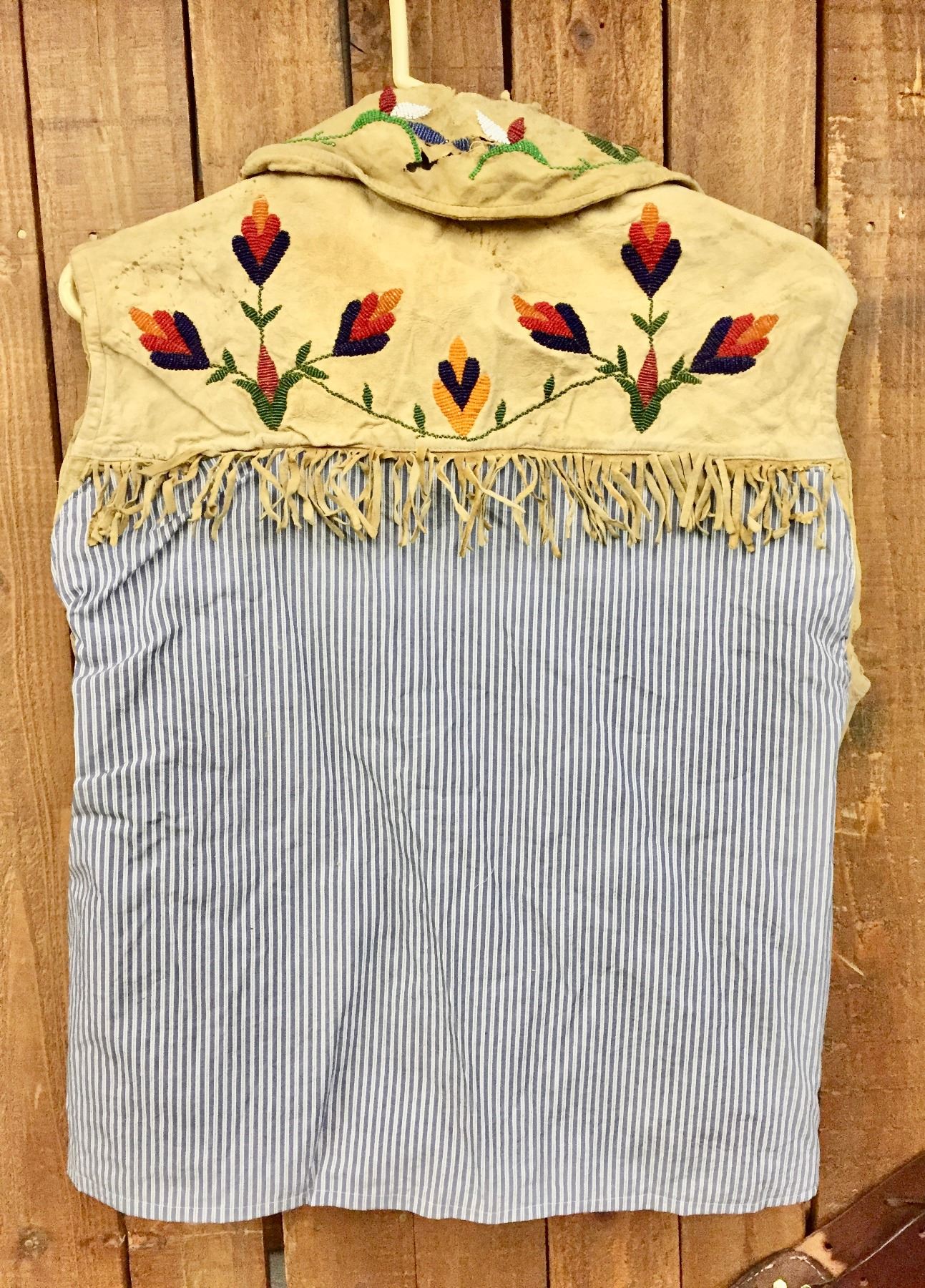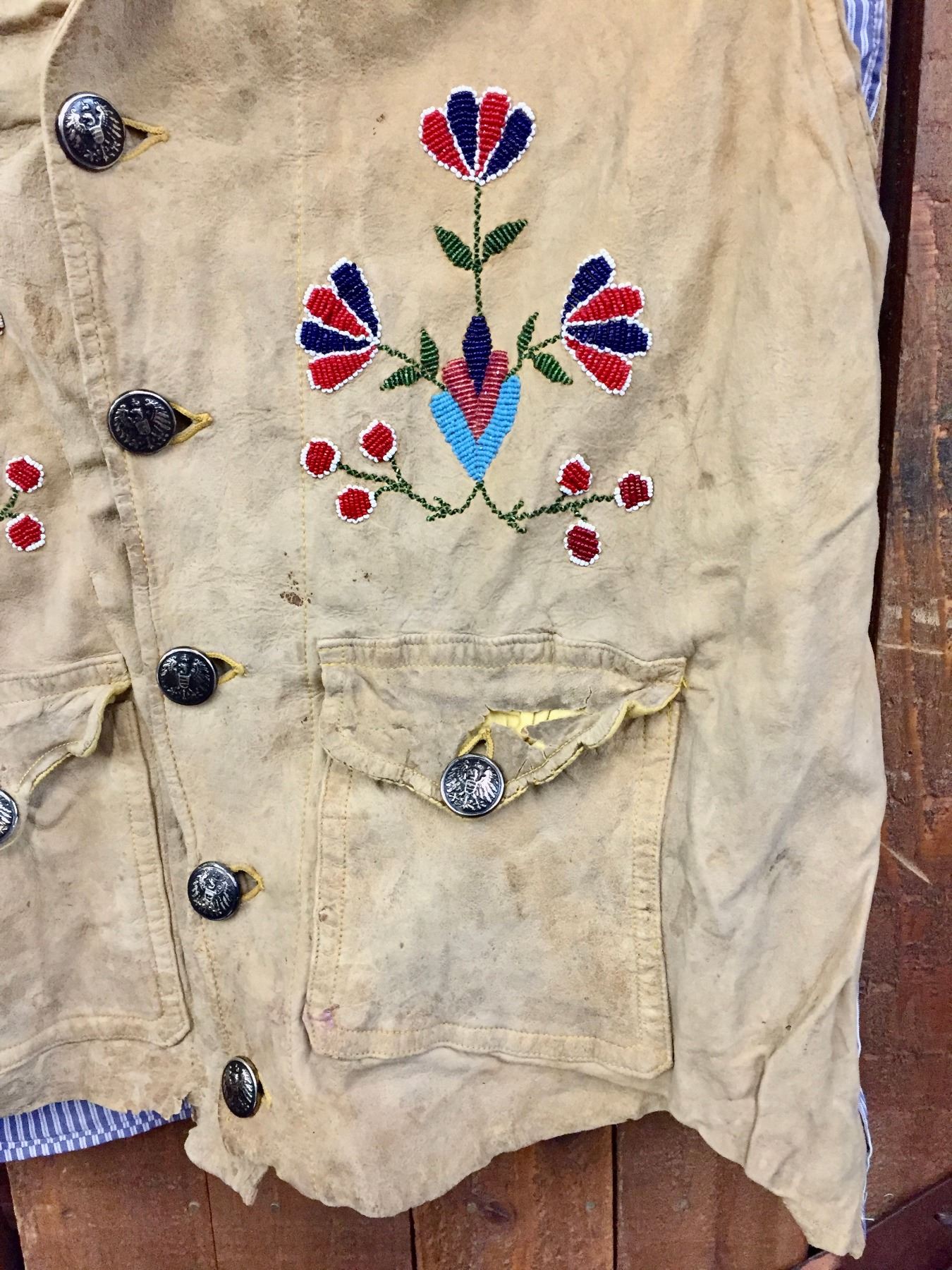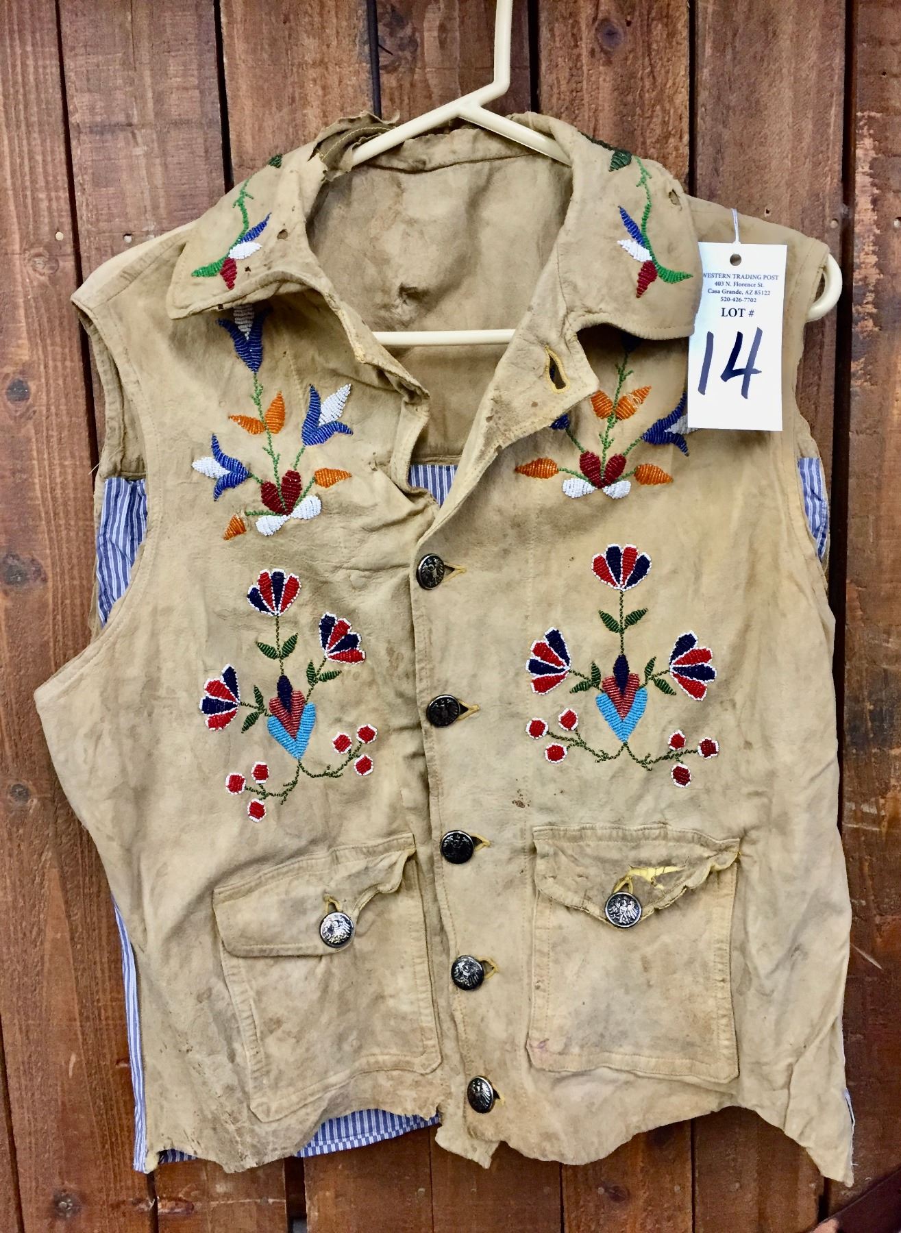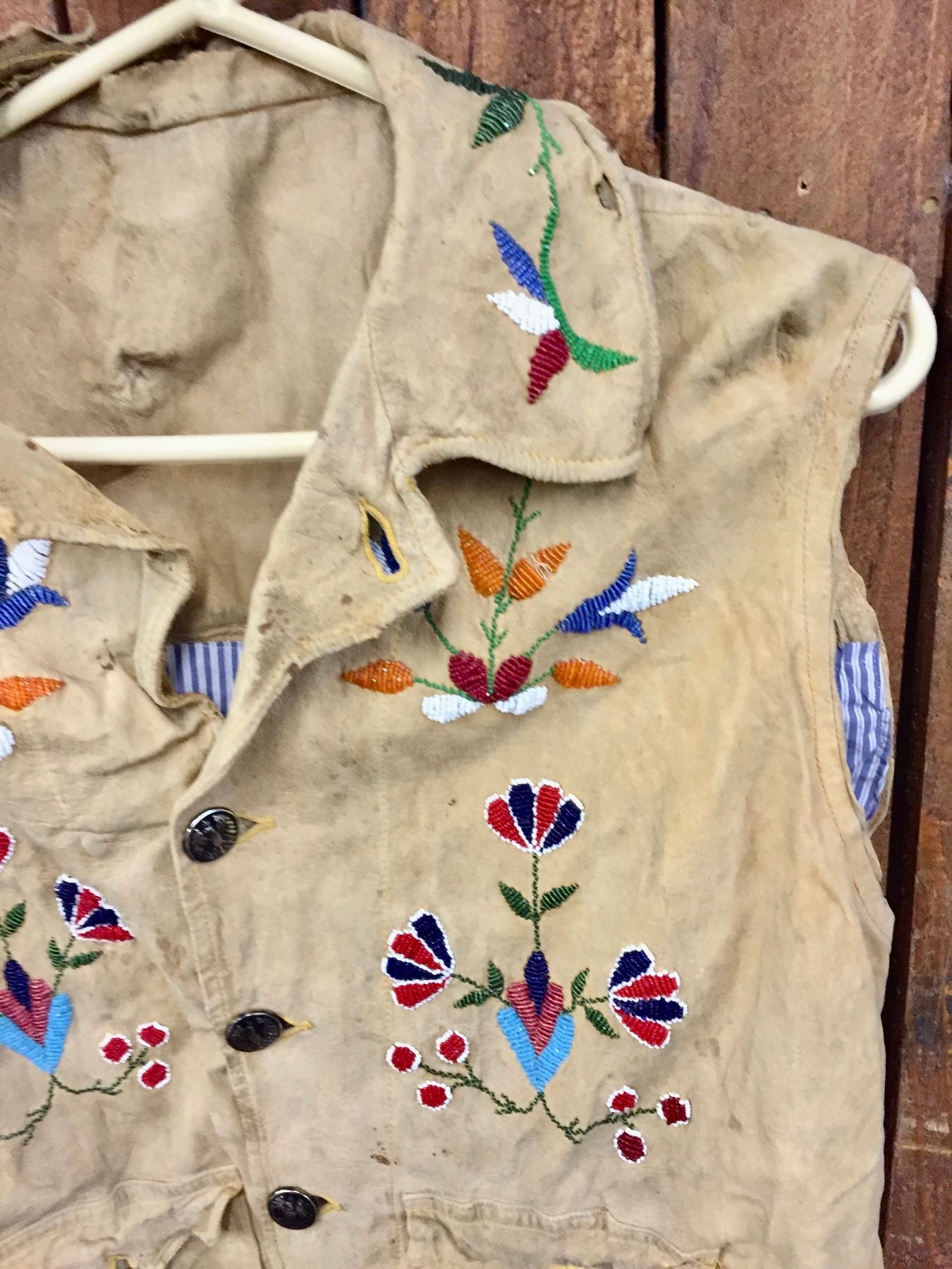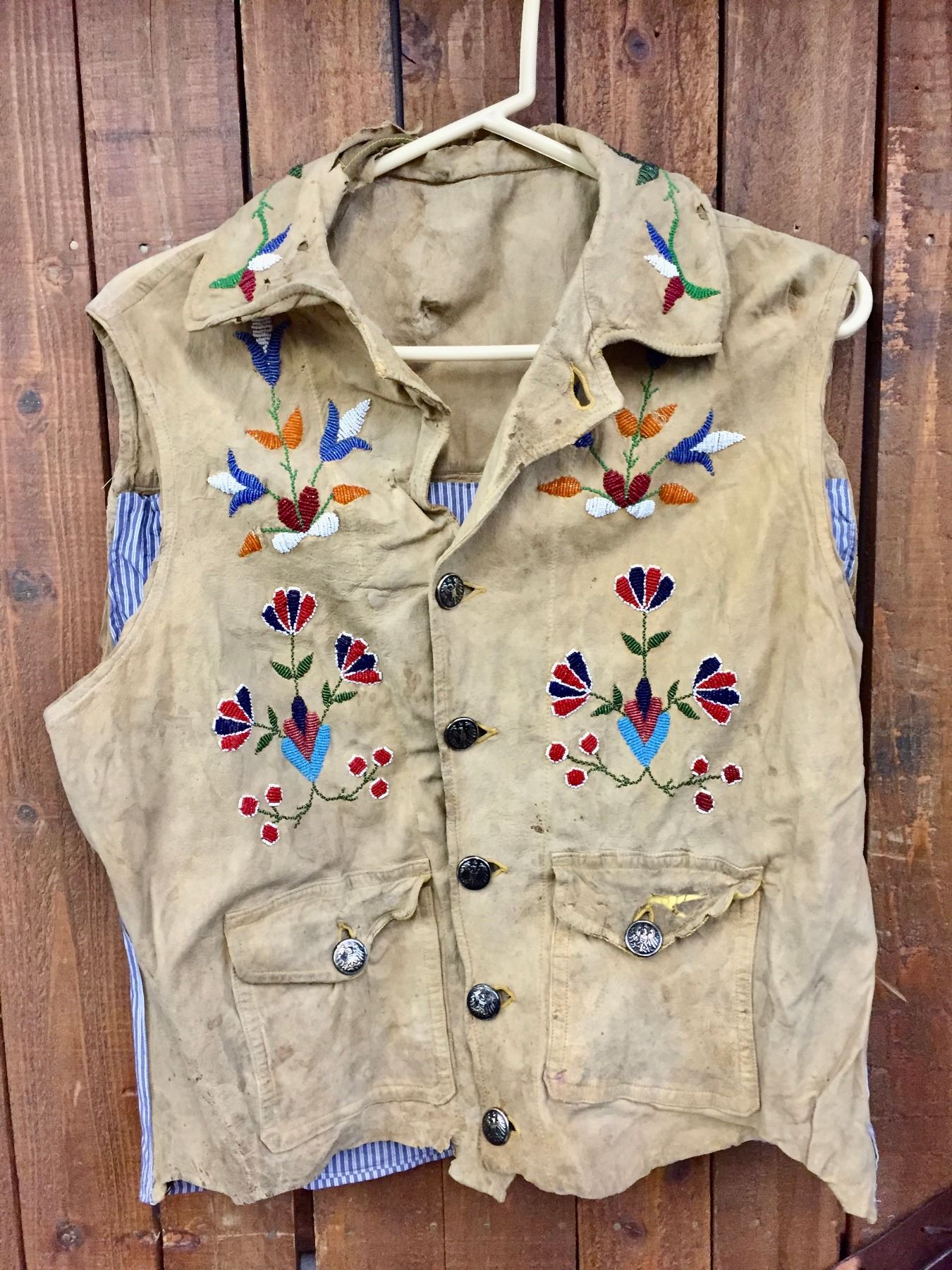 Description: Presented for sale in this lot is an old, hand crafted leather vest featuring intricate beading and highly detailed buttons.