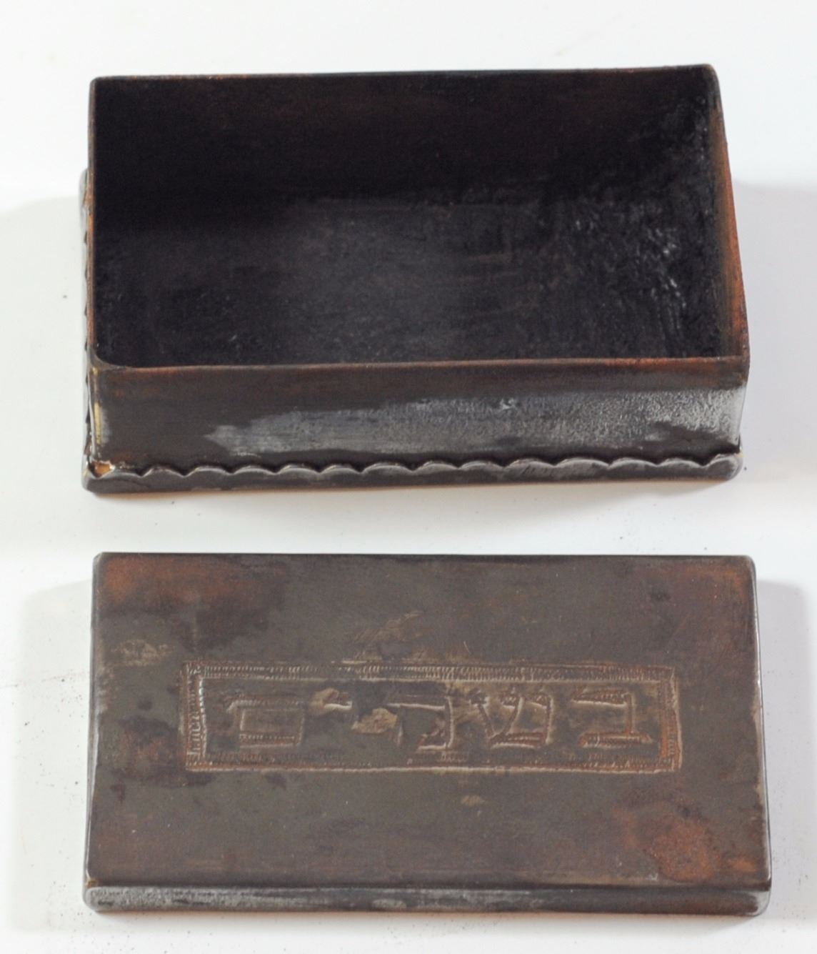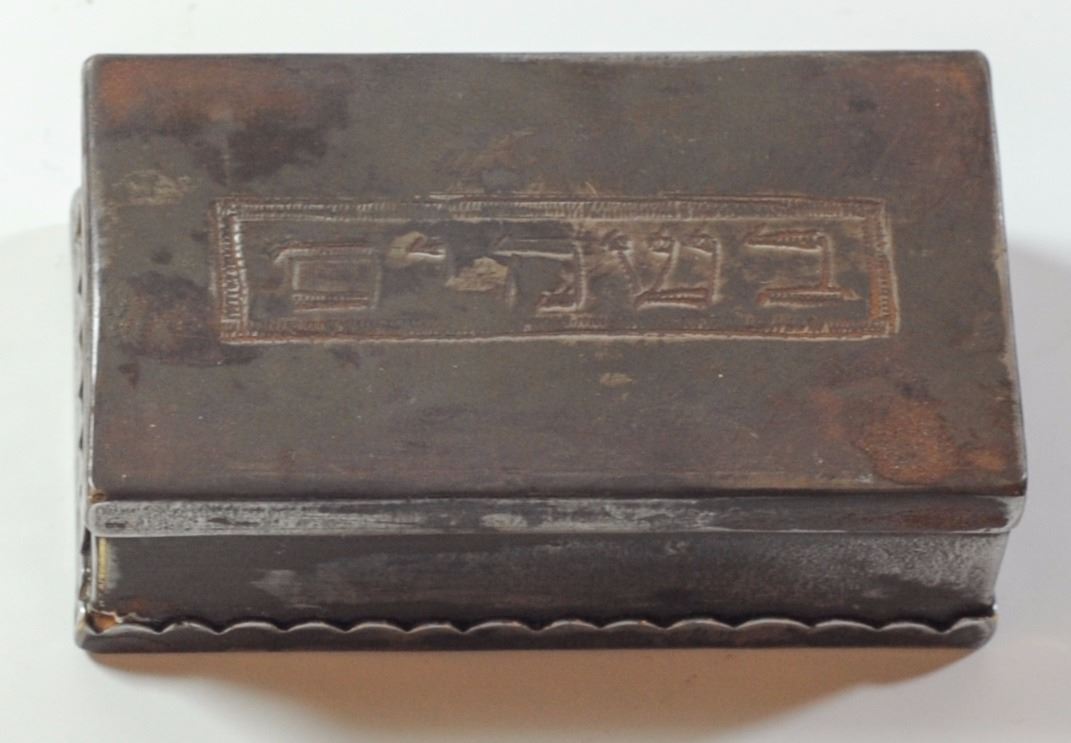 Old Besamim box, first half of the 20th century, pierced metal, cover embellished with the Hebrew inscription 'Besamim', dimensions: 6.5X3.5X2.5 cm.