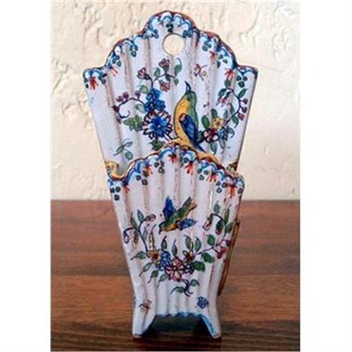 This is a lovely old French Faience Bird Wall Pocket made in the Desvres region of France. The subject matter is a small basket style vase with four legs. There is a match striker plate shaped like a shield on the side, and a hole in the back, suitable for hanging the item on the wall. The décor includes stylized bouquet, flowers and colorful birds. The modeling, decorating, and glaze are well done with typical colors of Desvres pottery: creamy white background decorated with bright dark blue, brilliant lemon yellow, iron red, and sage green. The backside, inside, and the underside are glazed. Desvres faience was a famous art pottery technique whereby tin glazes and decorations are applied over modeled terra cotta clay forms, and fired several times in a kiln. Please note this is not Quimper, but Desvres. Though similar, there are different color palettes used and other nuances on the two potteries. Dimensions (in inches): 5.2 Tall X 3.0 Wide X 1.4 Deep. Weight 4.5 Oz. The date is circa late 19th Century. The item is in very good condition, other than firing flaws and minor wear there have been no repairs or restorations. Shipping and Insurance USPS Priority Mail within the U.S. is $12.00. Thanks for bidding!