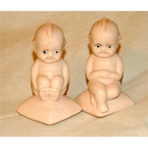 Adorable set of baby Kewpie Salt & Pepper Shakers. The are of bisque. The delicate paint on the eyes has rubbed off some. <p> They are both marked on the button with some leters and a symbol serperating the two letters. It look to me like a D & H. The mark in the middle looks like inward contured vase with 3 balls on top. Maybe it is a goblet overflowing with fruit. Anyway you can look at the picture. <p> They are 3 5/8" Tall. <p> Other than missing cork, worn paint on the eyes and a teeny,tiny bit of grime the condition is excellent on both. <p> I purchased these from my favorite little old lady at a local fleamarket who has collected item of all sorts for over 50 years.
