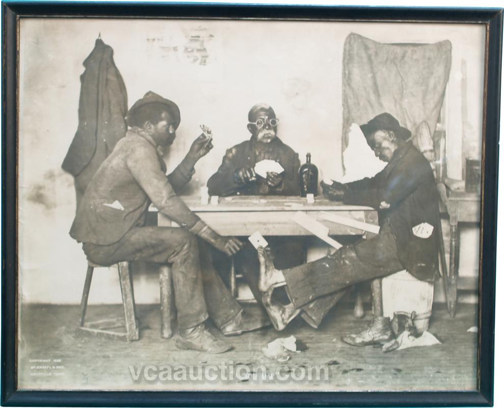 Old Black Americana "A Skin Game" Print, depicts 3 men playing poker, Copyright 1898 by Knaffl & Bro. Knoxville, TENN. in frame - 21" x 17"
