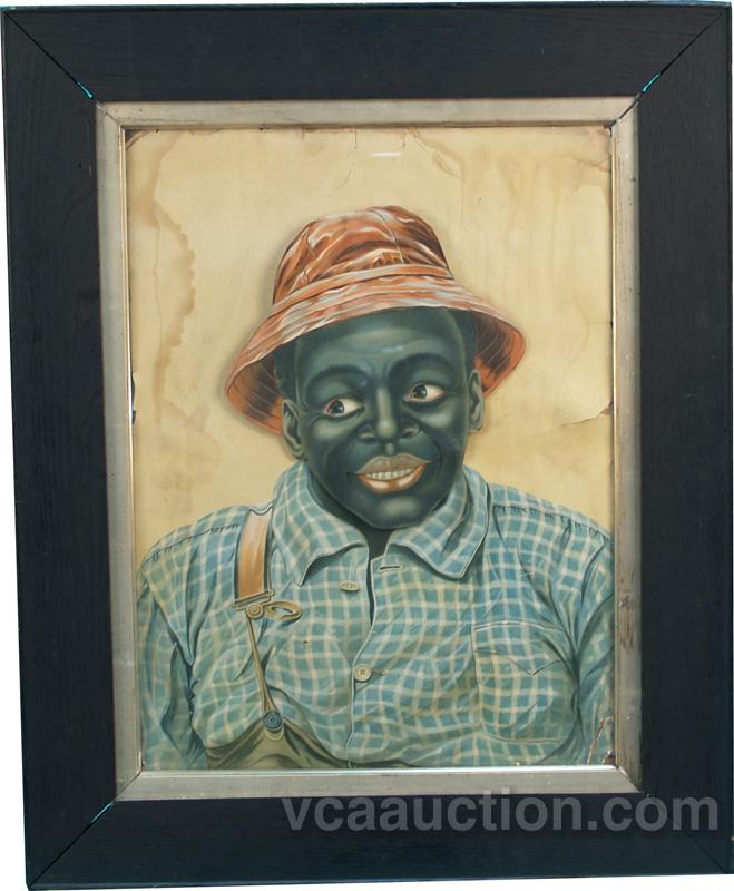 Old Black Americana Moveable Wind-Up Print, (eyes & mouth move) works, all original in frame - 22" x 27"