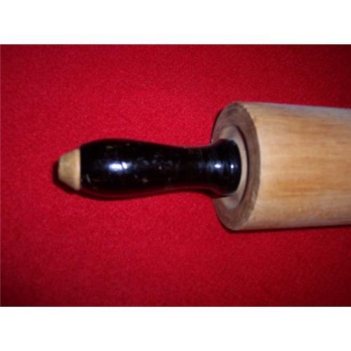 Nice vintage rolling pin with wonderful black handles.Great in the country kitchen.Does have a small chip of wood out of the end of one of the handles but does not deter from use or display.