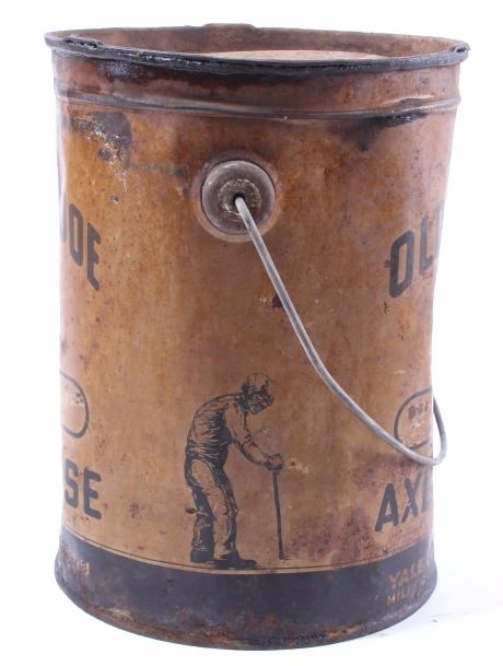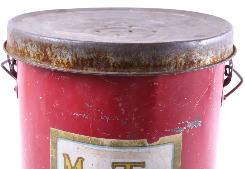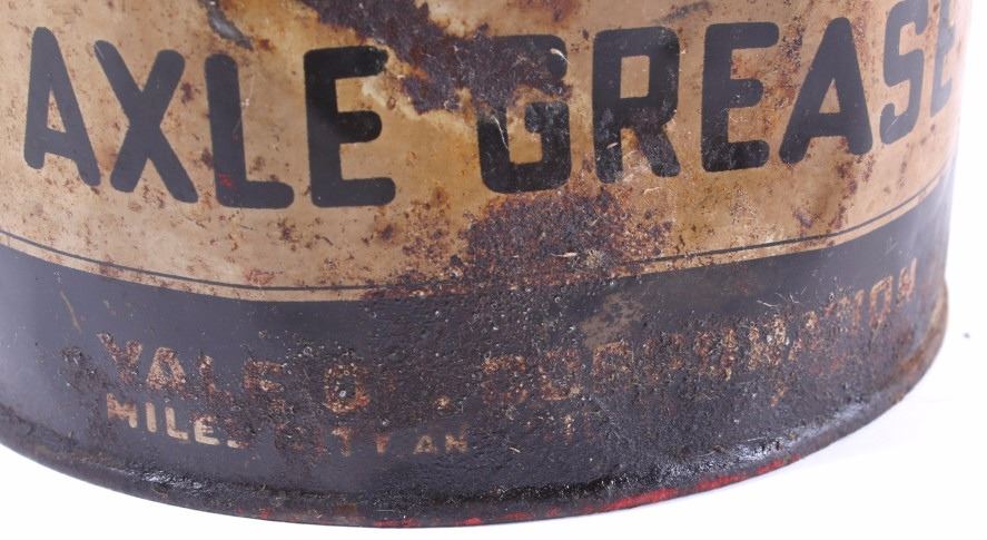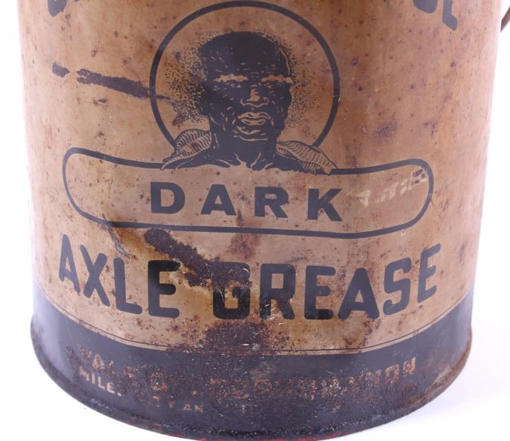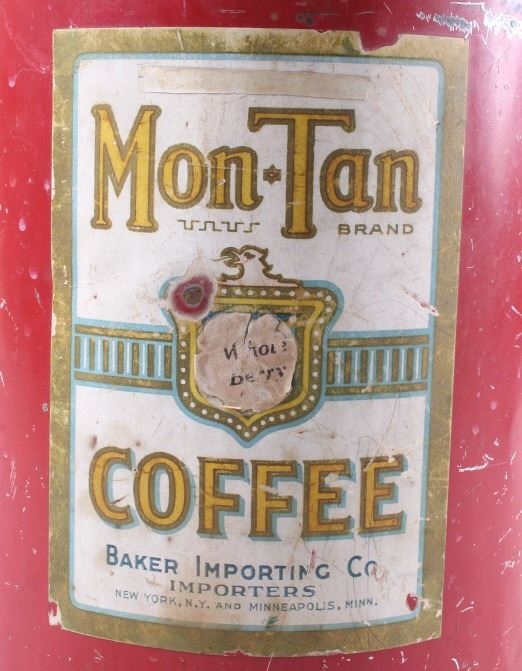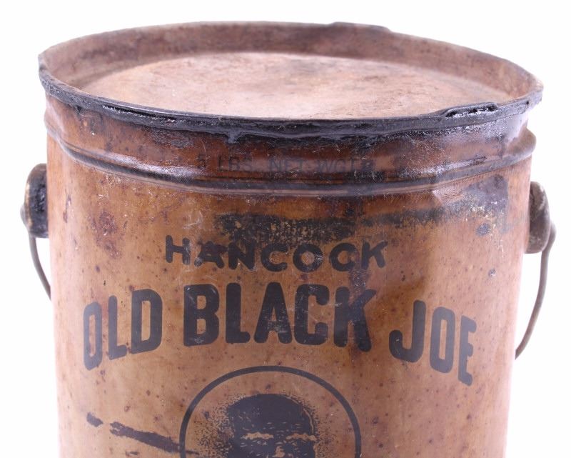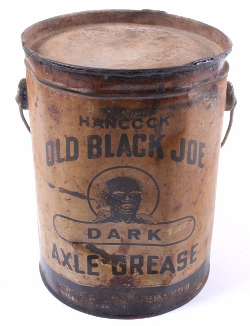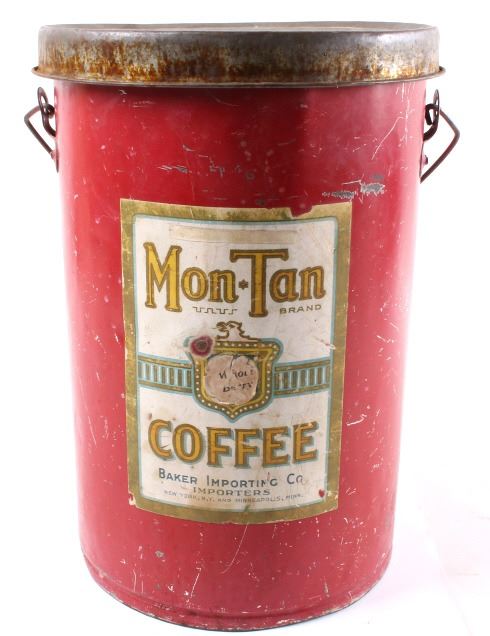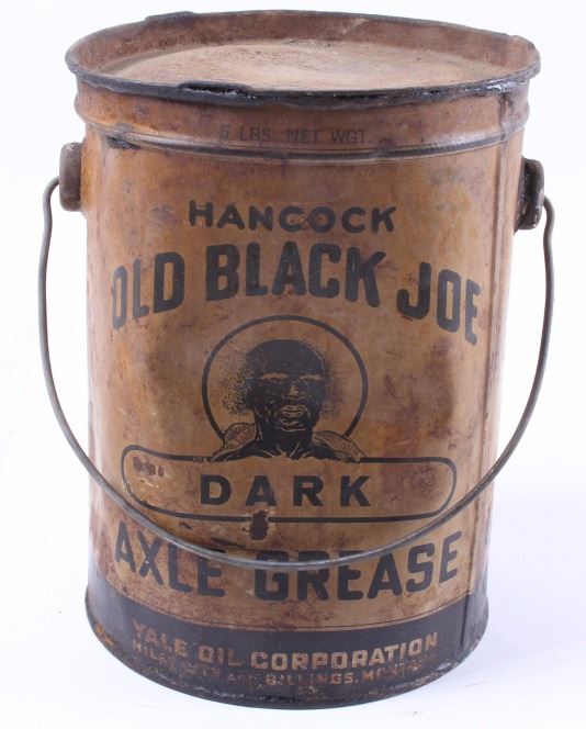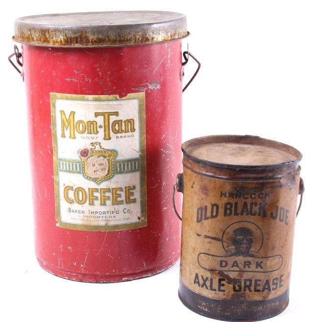 This is an original Old Black Joe dark axle grease can from Montana and a Mon Tan large coffee tin. The can was made by Hancock and distributed through the Yale Oil Corporation of Miles City, Montana. The can shows the images of Black Joe on the label. The label is an earlier known version to exist as it reads "Dark Axle Grease". The Mon Tan brand coffee tin has the original sticker tin top. The tin can features a red color and bail and wooden handle. The Old Black Joe grease can is in good overall condition for its age. The can does have moderate wear and rust as shown. A great piece of Black Americana and Montana history. The Mon Tan tin can is in good condition, with some signs of wear. The cans measures 5 3/4" Dia x 7 5/8" H and 9" Dia x 13 1/4" H