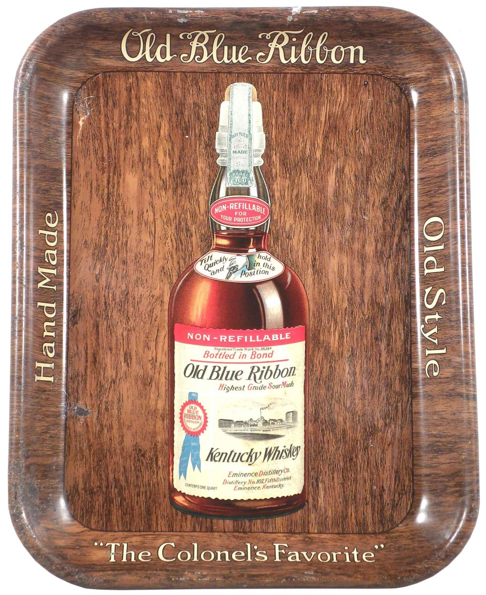 Old Blue Ribbon Kentucky Whiskey Tin Serving Tray. "The Colonel's Favorite". A couple of rust spots and a few edge chips otherwise very good condition. 10 1/2 X 13 1/4 inches.