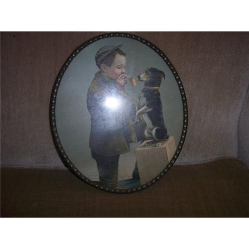 This is another wonderful flue cover.It is a boy and his dog smoking. Measures a large 9 1/2" tall,and has a wonderful metal frame.There is very light water damage on the bottom of this(see photo) but is not that noticeable when hanging.Very unusual flue cover and Made in Germany.These are all old ones not the repros that are out today.