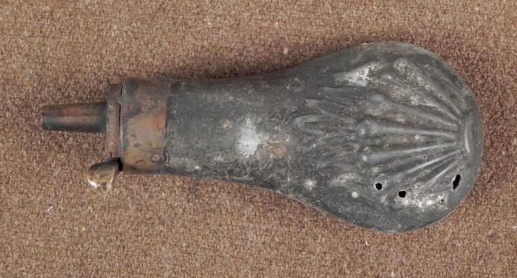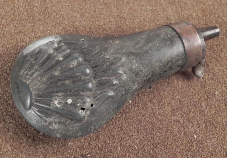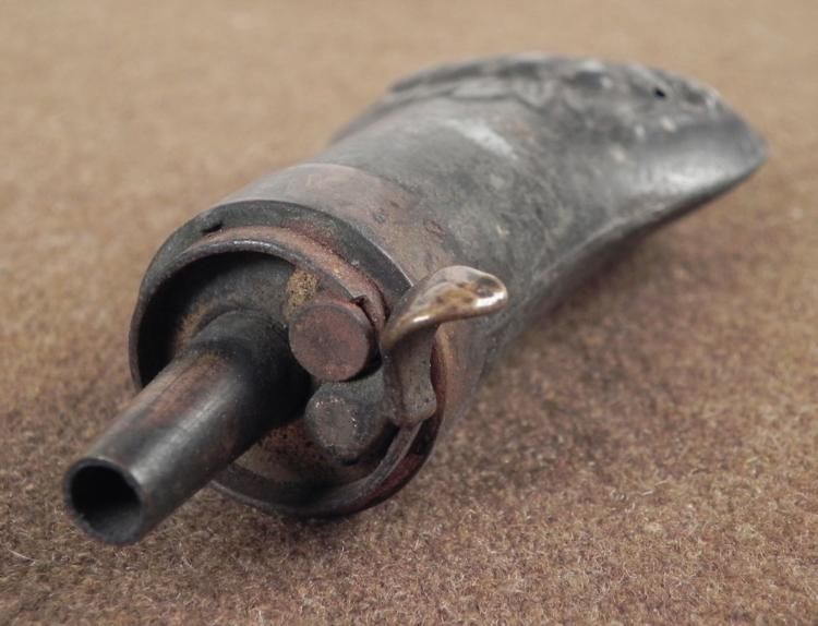 This brass powder flask is very old, and has a Wild West style. It features a feathers pattern inspired by Native Americans. The lever at the top moves. The detail is very good on the raised designs. There are a few dings, and areas of white oxidation * which could be cleaned up. Overall it is in very good condition. The size is 4 1/2" x 2". * * This will be great for any Western or early American military collection. *