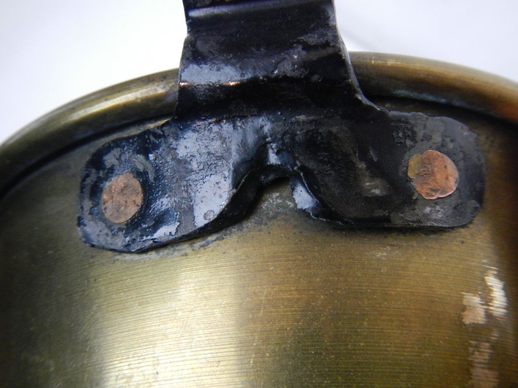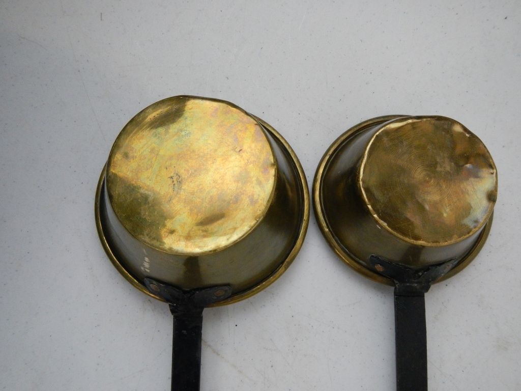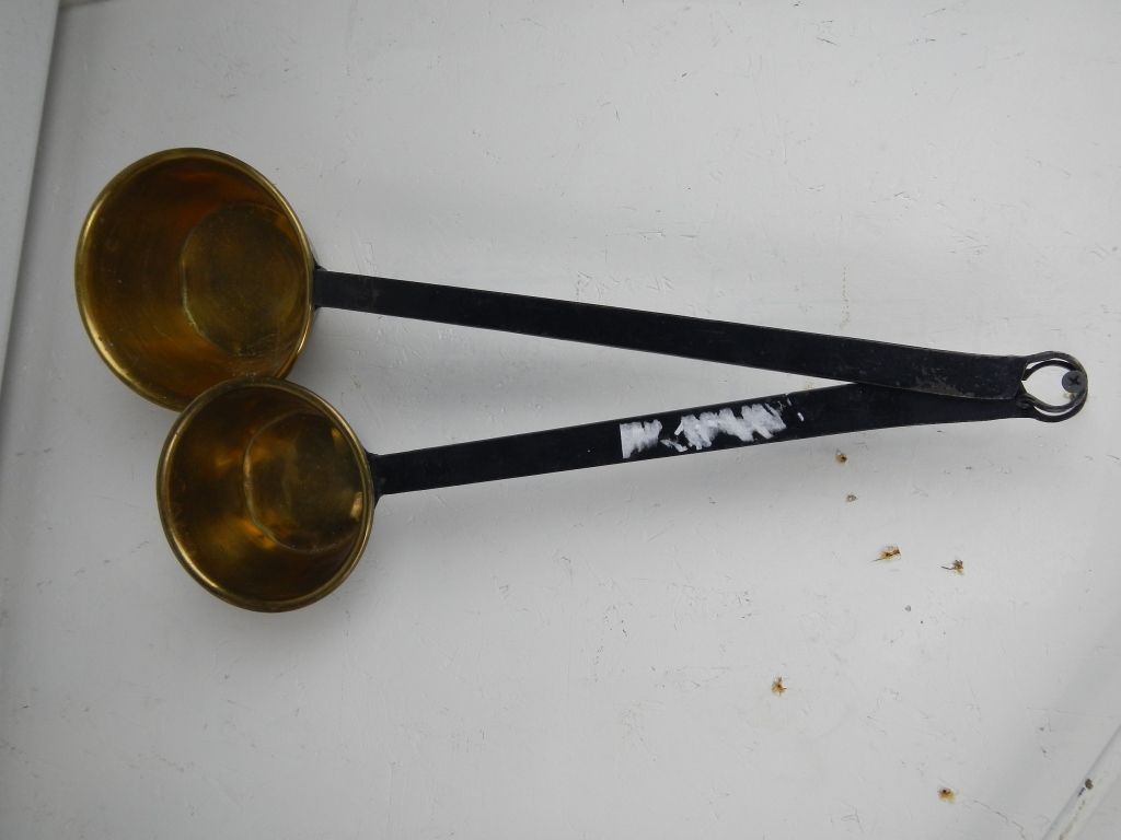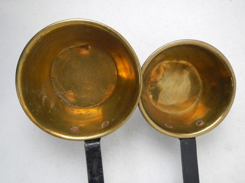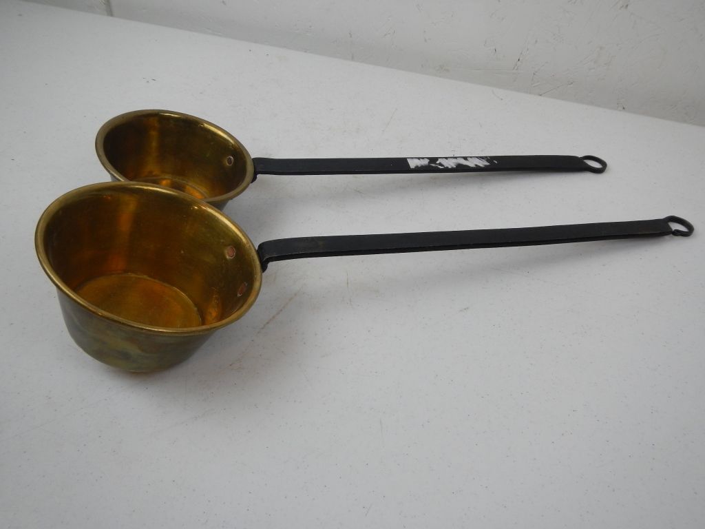 Old Brass Ladles - This lot includes two Brass pots or ladles with blacksmithed handles. The handles are connected to the pots by copper rivets and the handles are hammer forged. Measures 18" and 20.5"