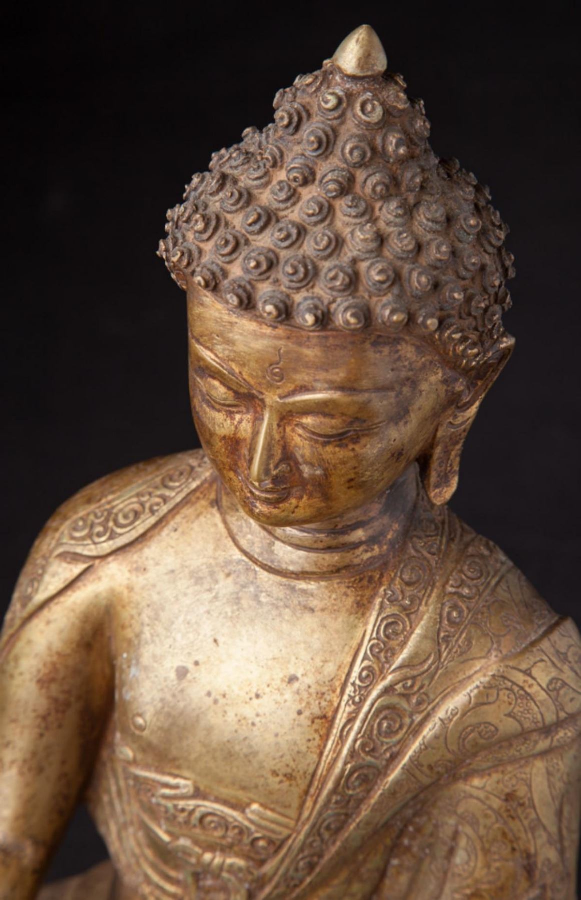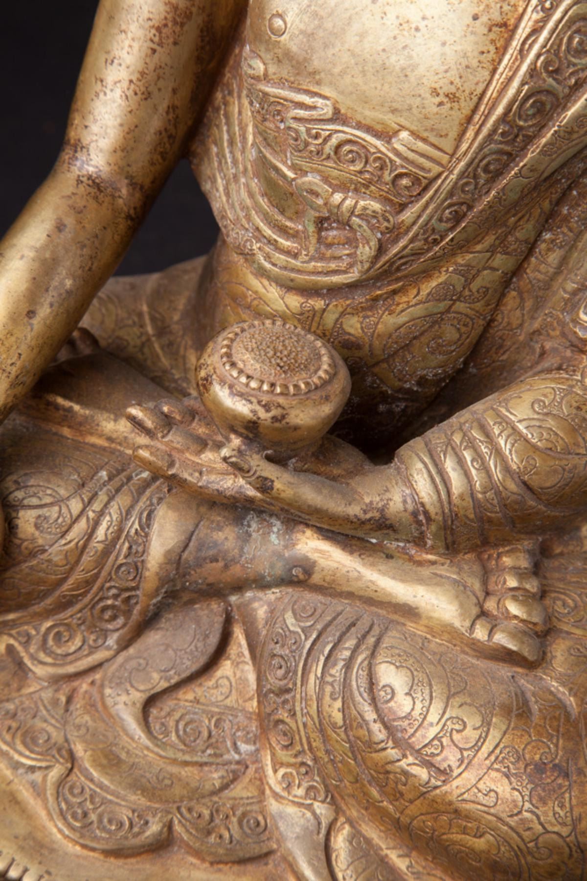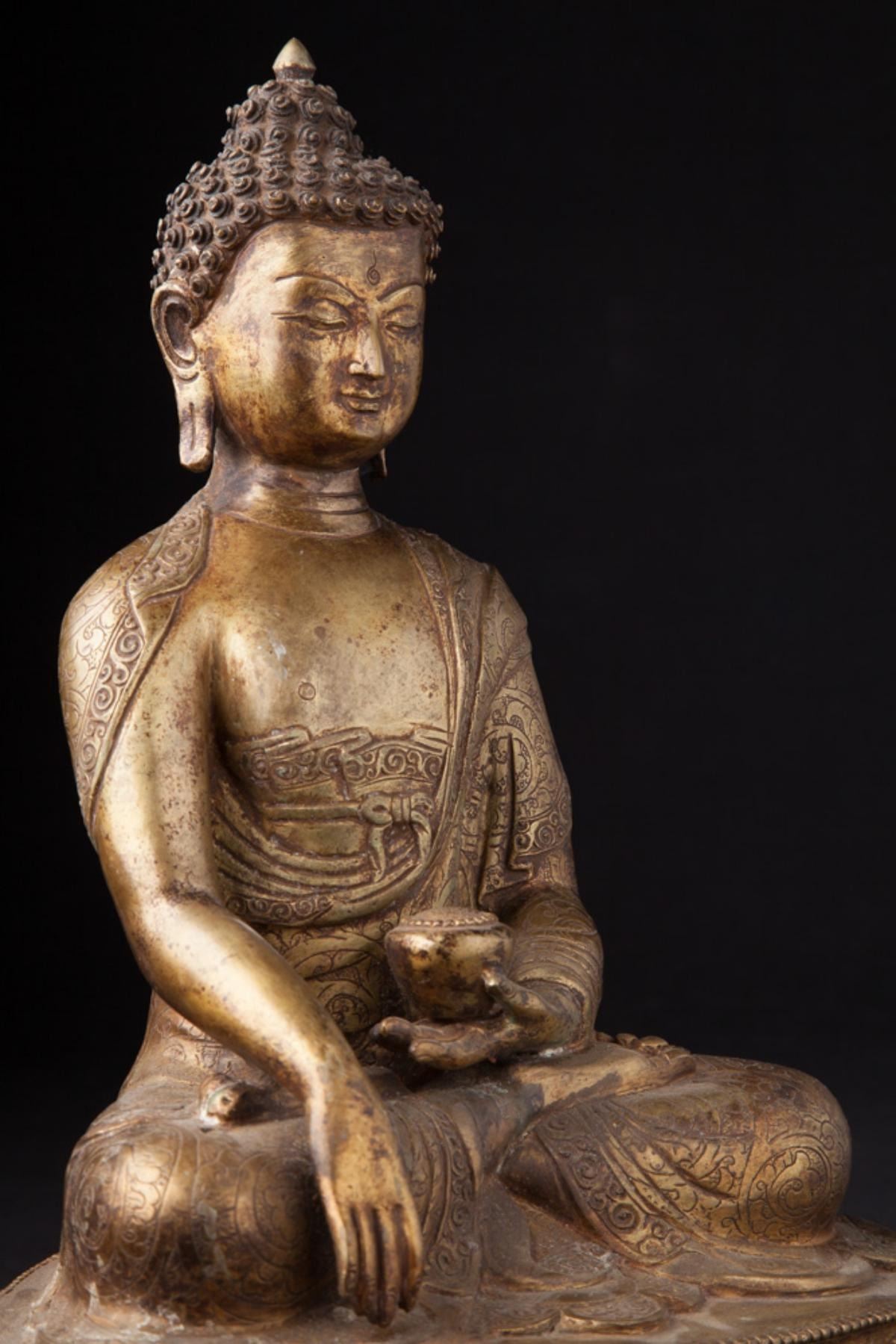 Old Buddha Statue....Material: Bronze;35 cm high;23 cm wide and 16 cm deepFire gilded with 24 krt. gold; Bhumisparsha Mudra......Origin - Nepal