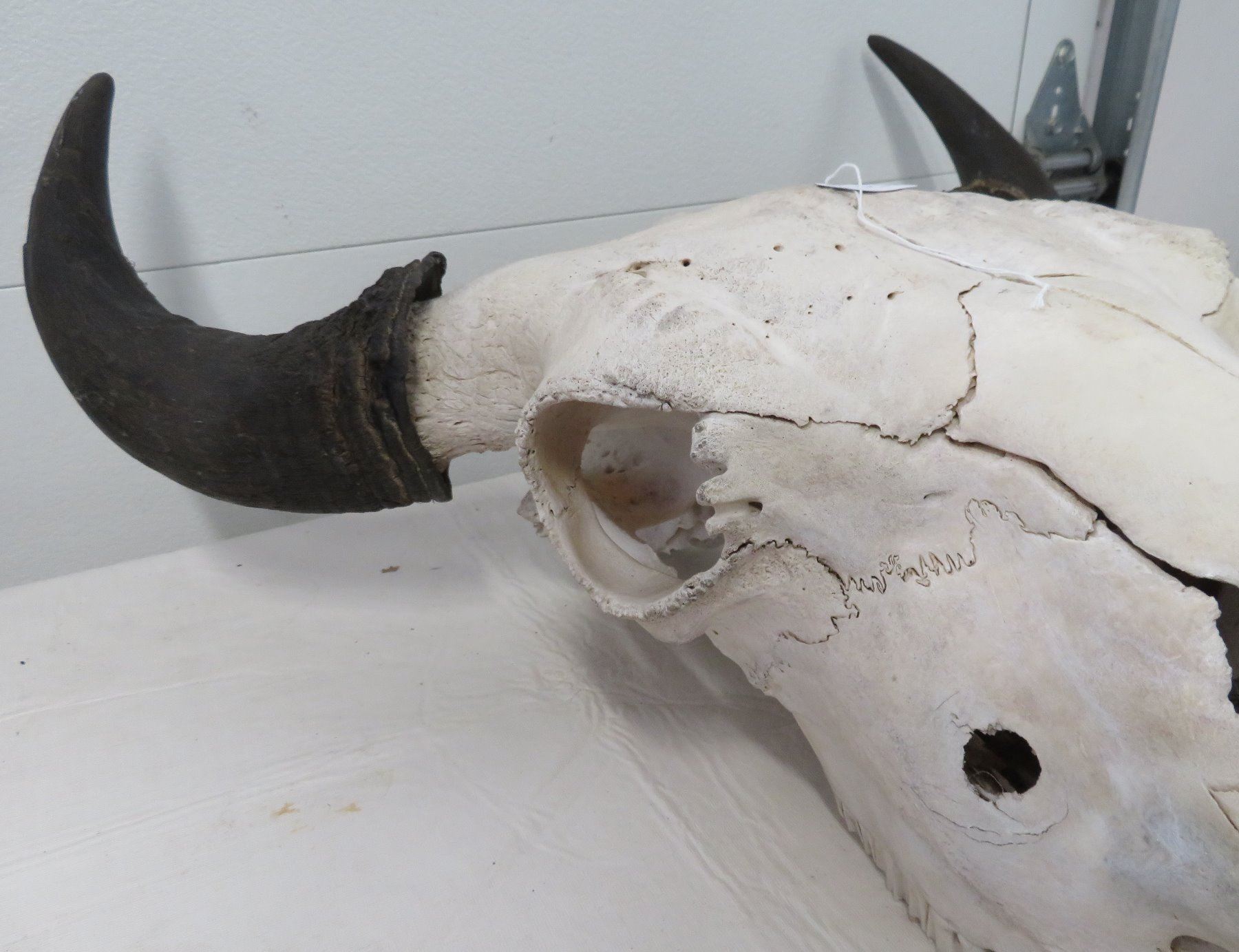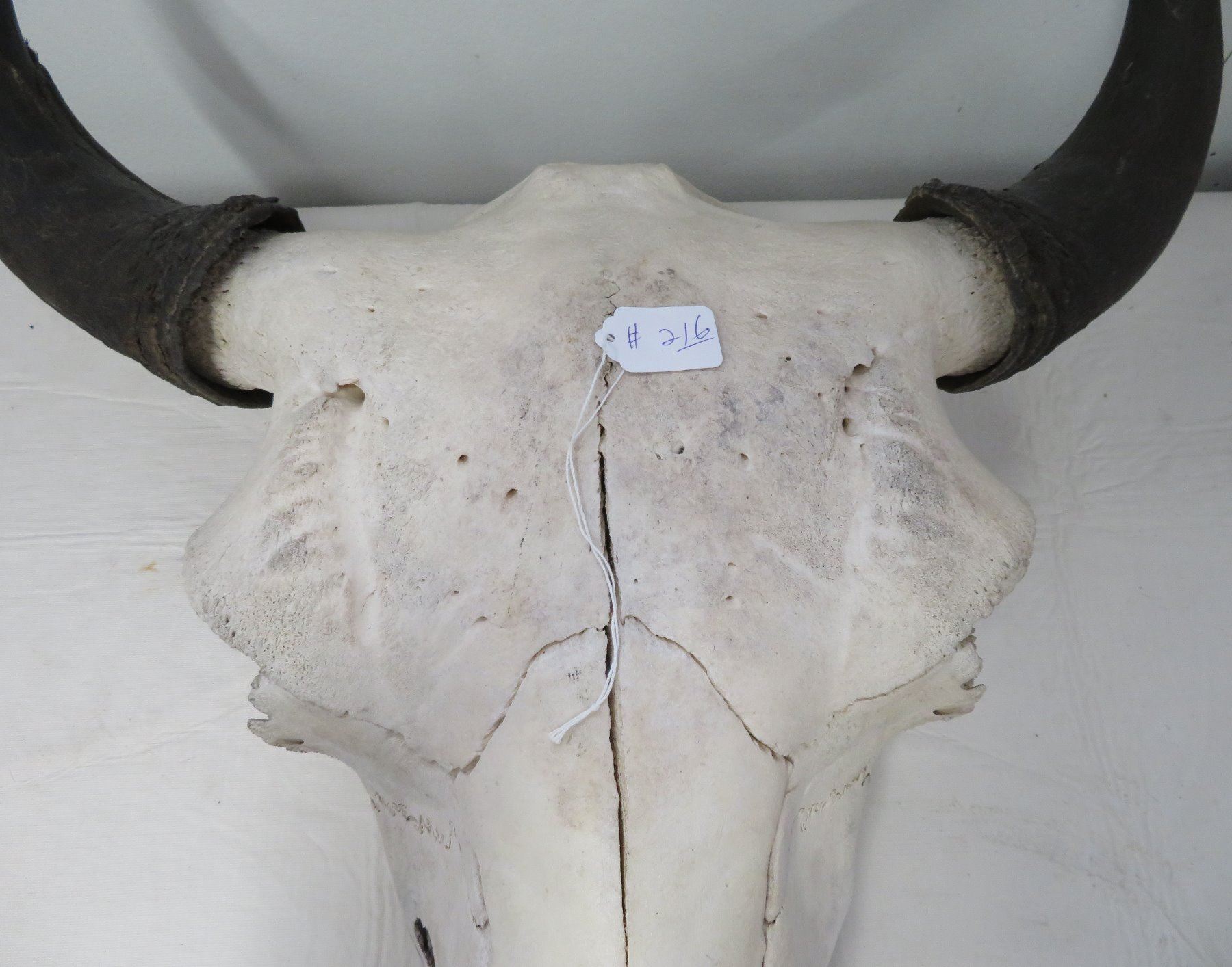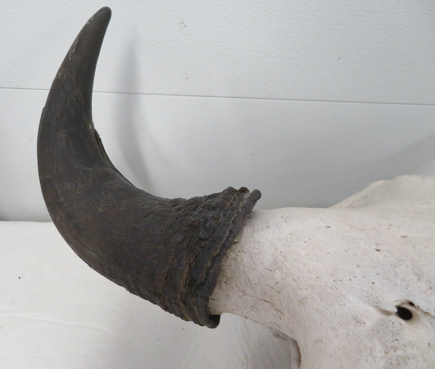 Old Bull Buffalo Skull, c. 1960s. Made of bone and horn, the item measures 21" x 20" x 8". Montana. Has horn caps, bullet hole, postcard. Condition: Hole in nose, see images. Shipping: $65.00 USA estimate only, due to size and weight, double-boxed.