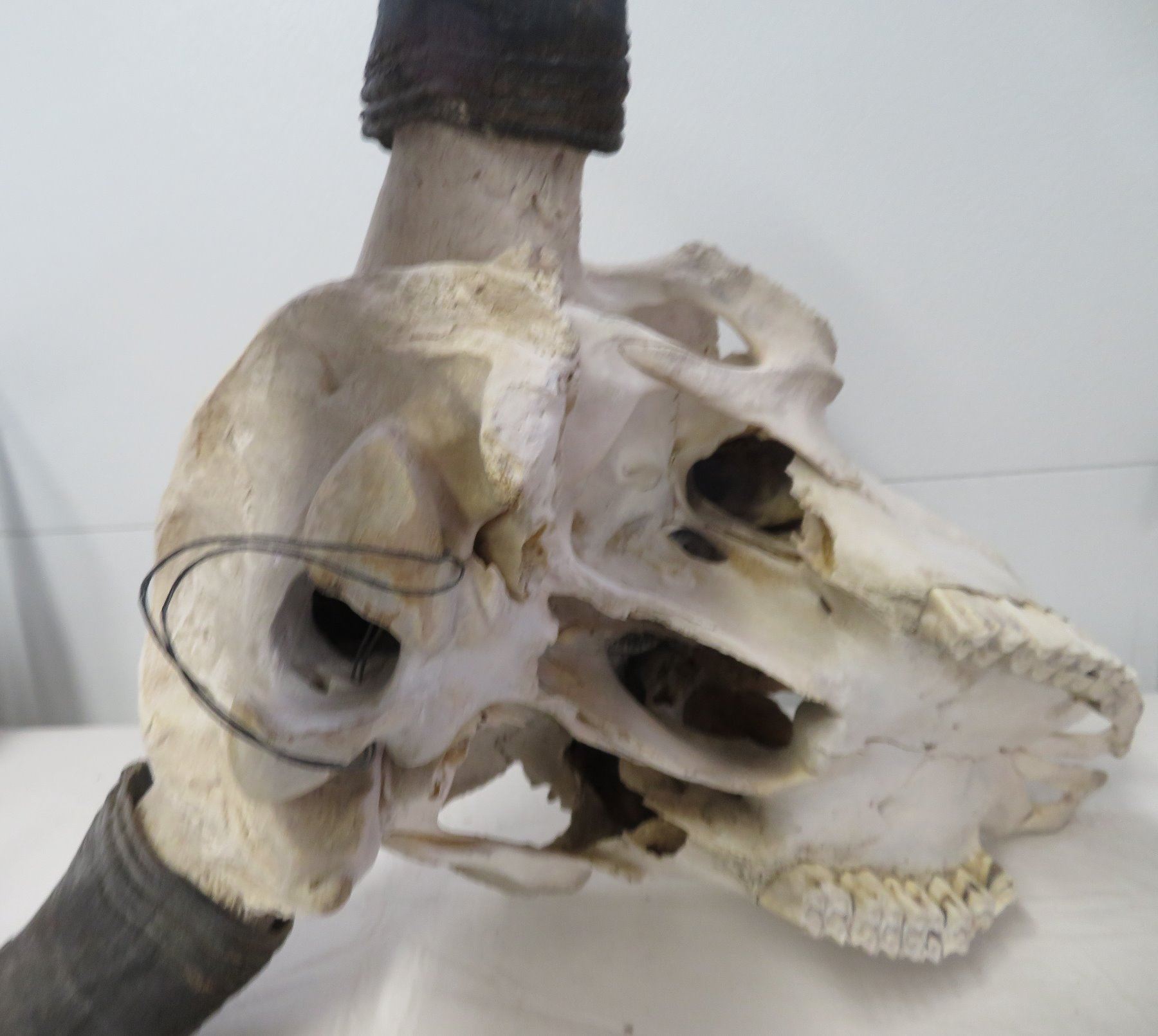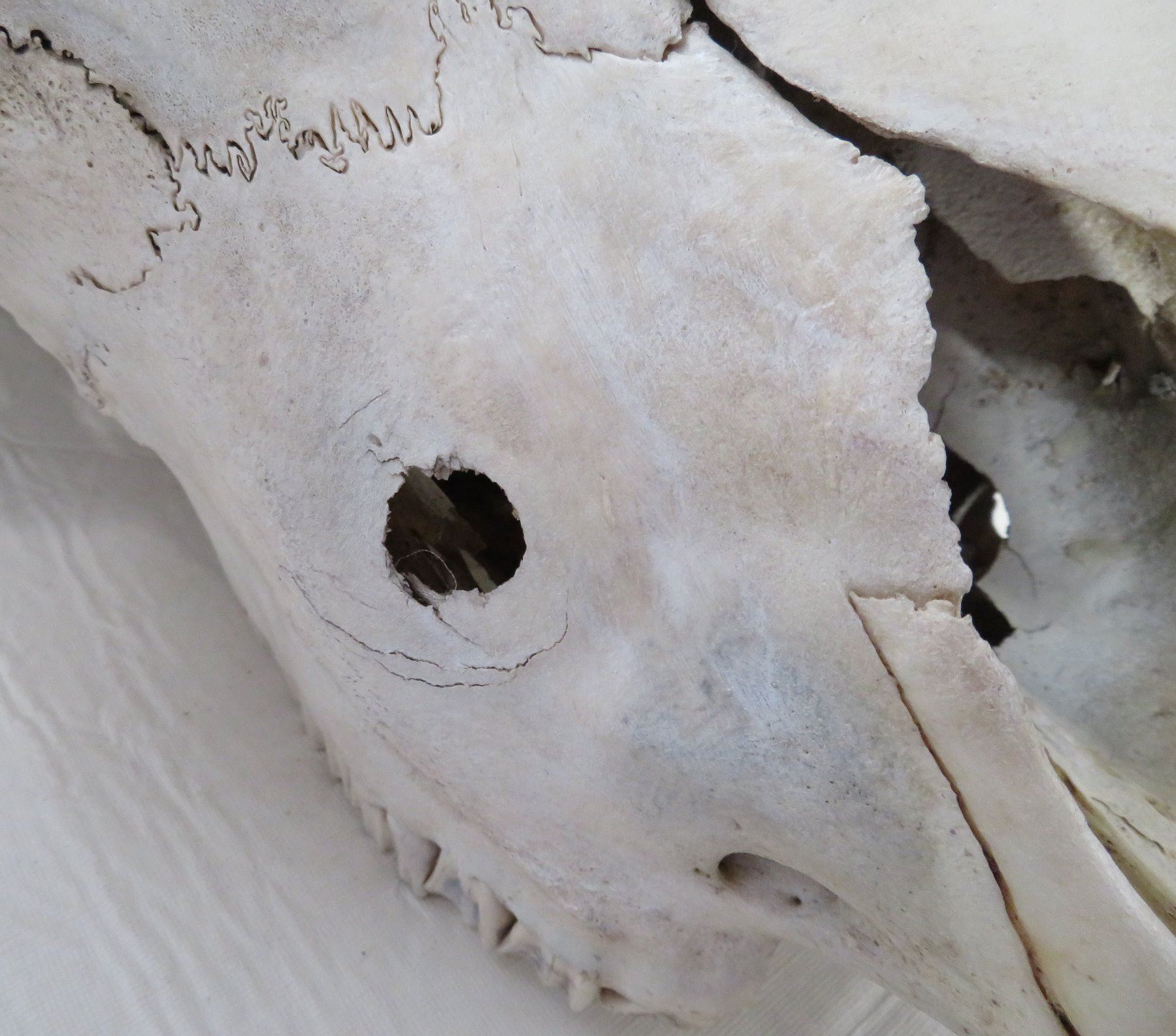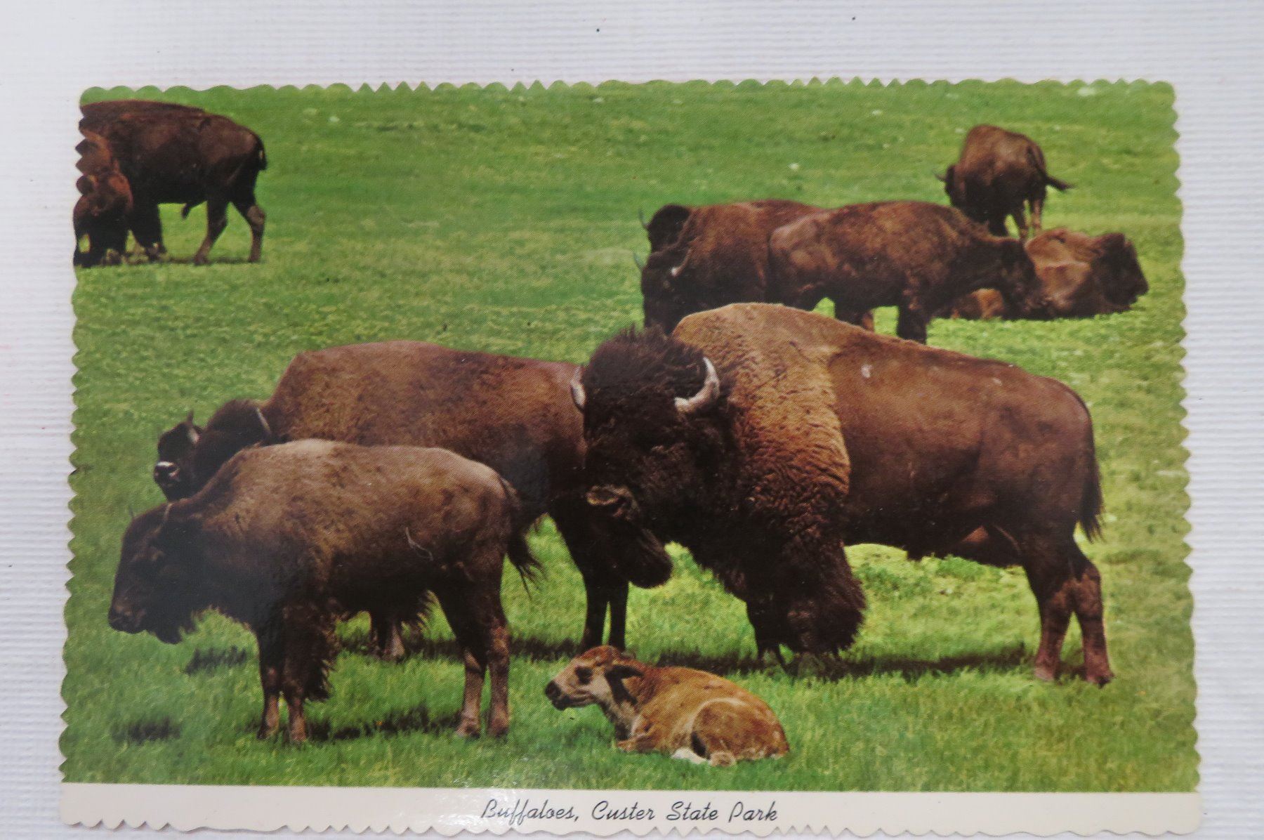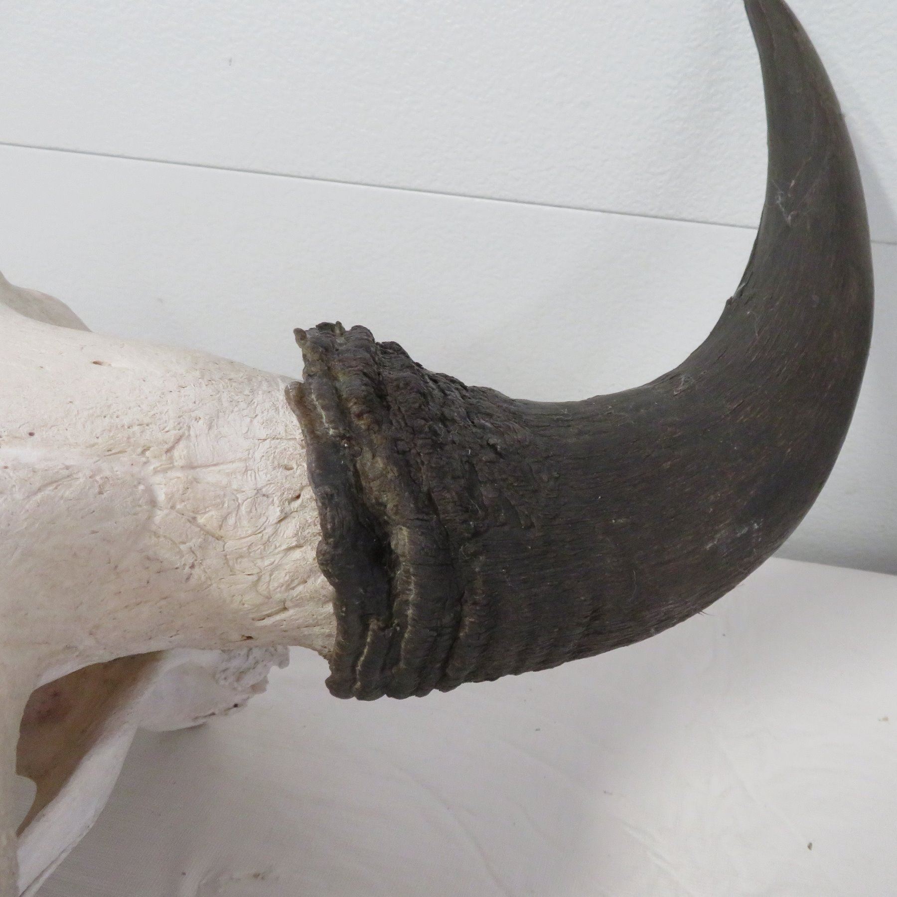 Old Bull Buffalo Skull, c. 1960s. Made of bone and horn, the item measures 21" x 20" x 8". Montana. Has horn caps, bullet hole, postcard. Condition: Hole in nose, see images. Shipping: $65.00 USA estimate only, due to size and weight, double-boxed.