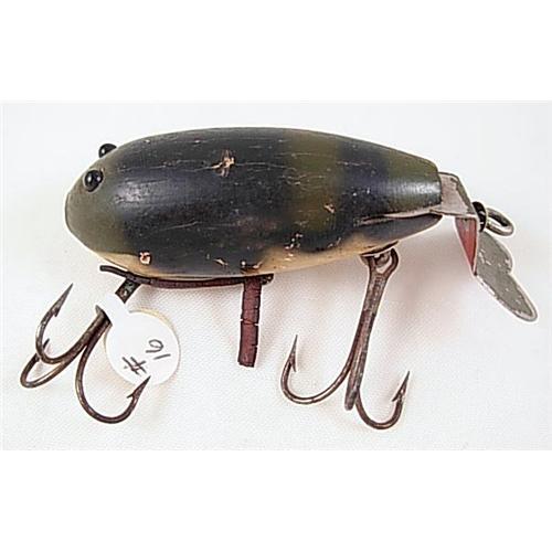 A vintage wooden natural crab color C.C.B.C. baby crawdad lure in very good condition. There are a few small dings noted to the body, a few of the rubberband legs have broken off, and a small amount of the army green and the red paint are missing on the metal tail but all in all still in very good condition. It measures 2 1/2" long without hardware included, and 3 1/4" long including hardware. It also still retains it's original eyes, which is usually the first thing to go. Add this great item to your vintage fishing lure collection!