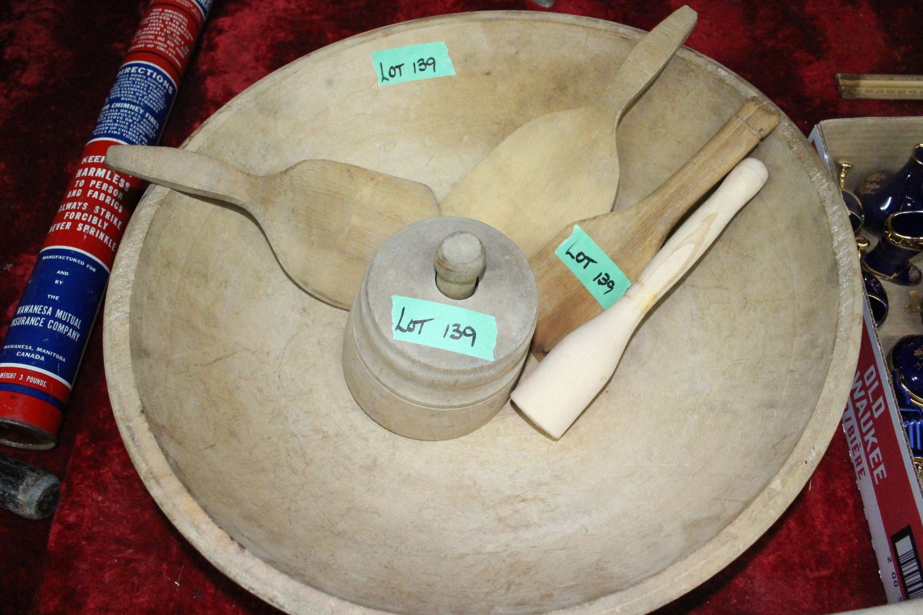 Old Carved Wooden Mixing Bowl with 3 Butter Paddles & a Round Butter Press