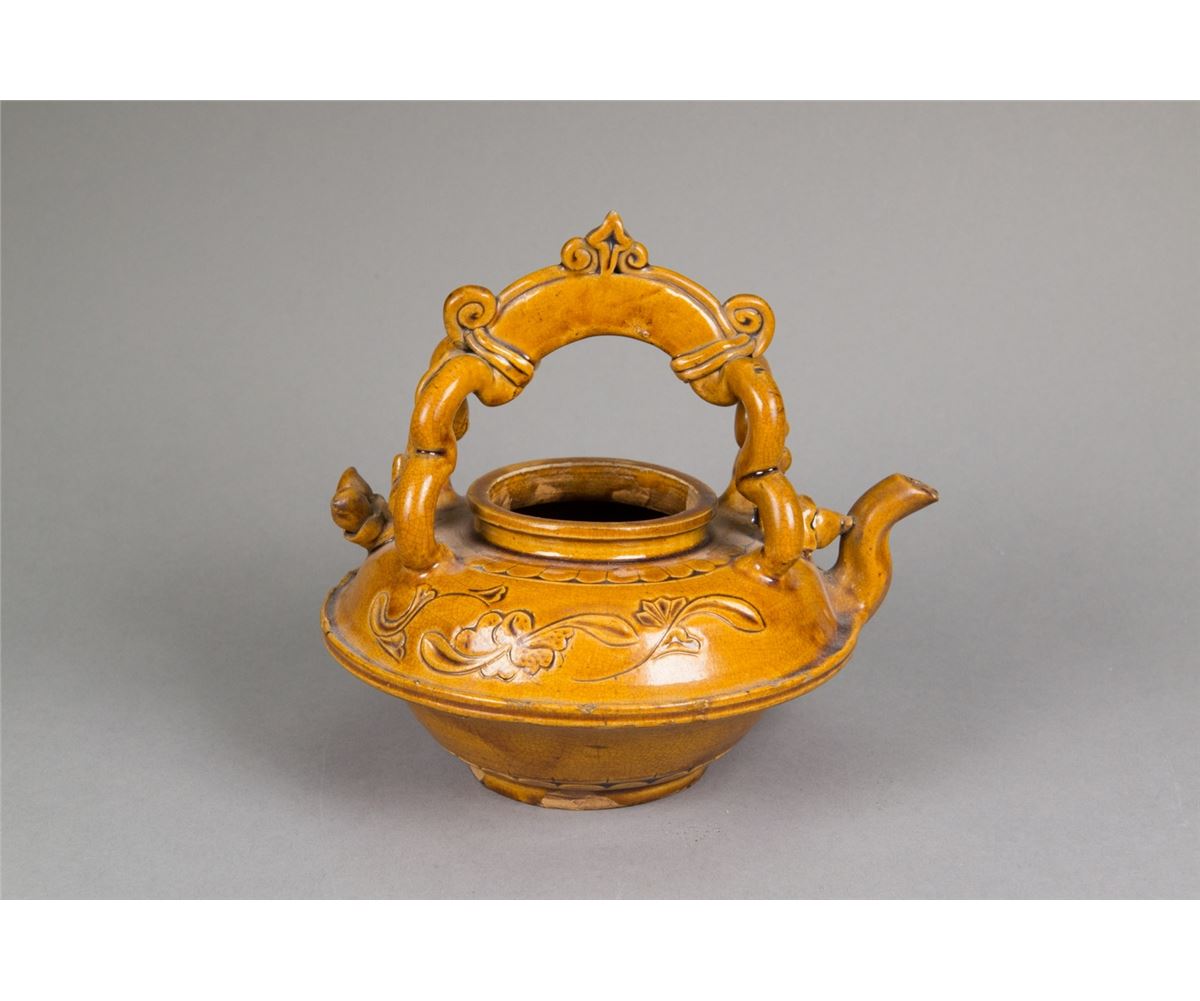 Old carved Zisha porcelain tea pot; flattened ovoid form featuring scroll in relief; H: 17 cm, W: 15 cm, 526 grams