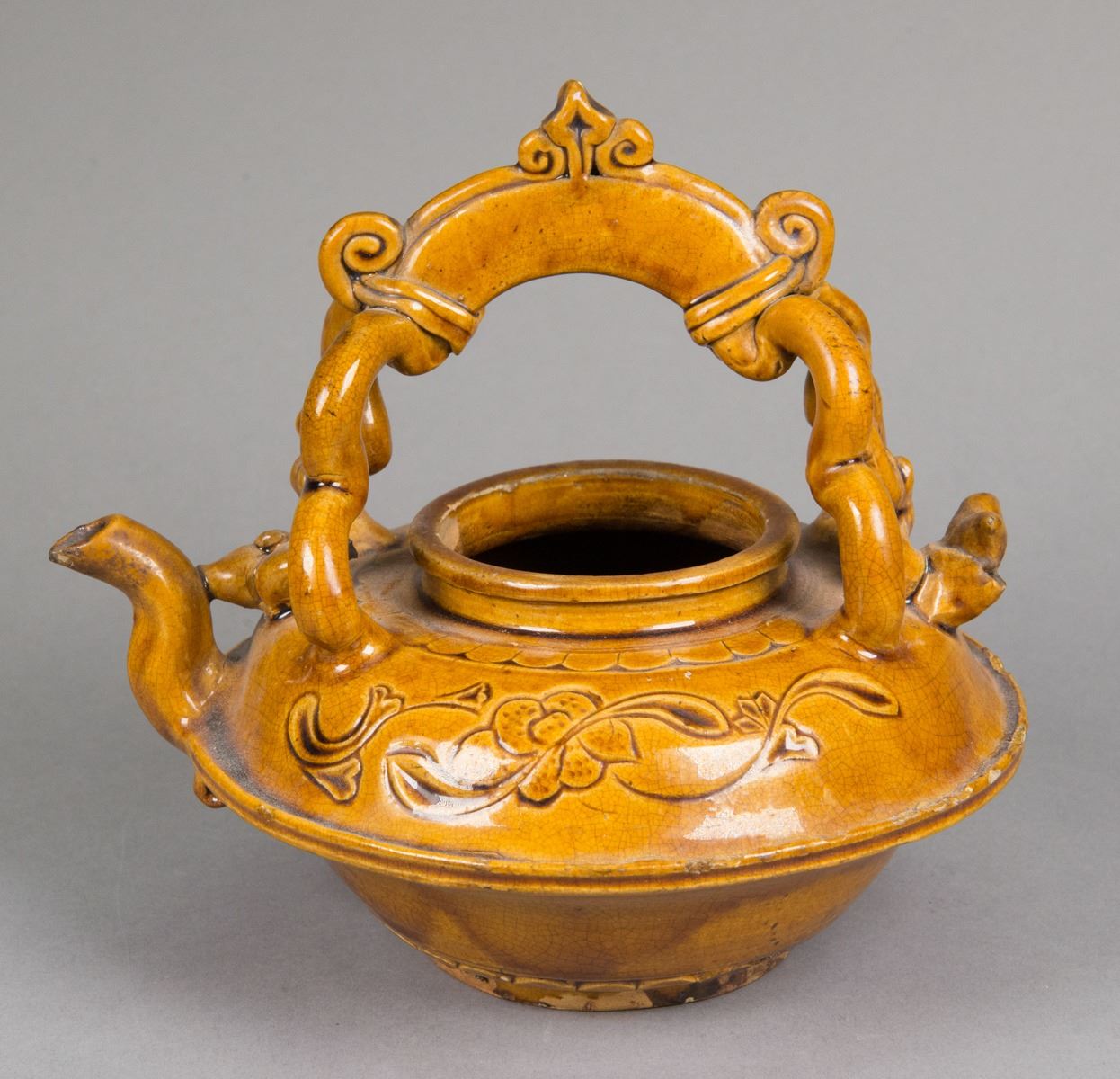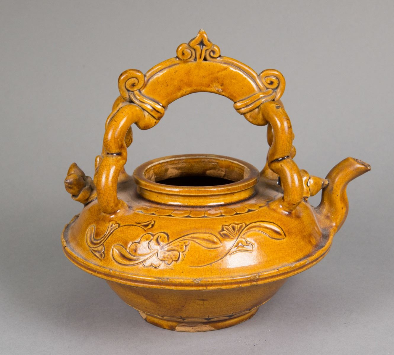 Old carved Zisha porcelain tea pot; flattened ovoid form featuring scroll in relief; H: 17 cm, W: 15 cm, 526 grams
