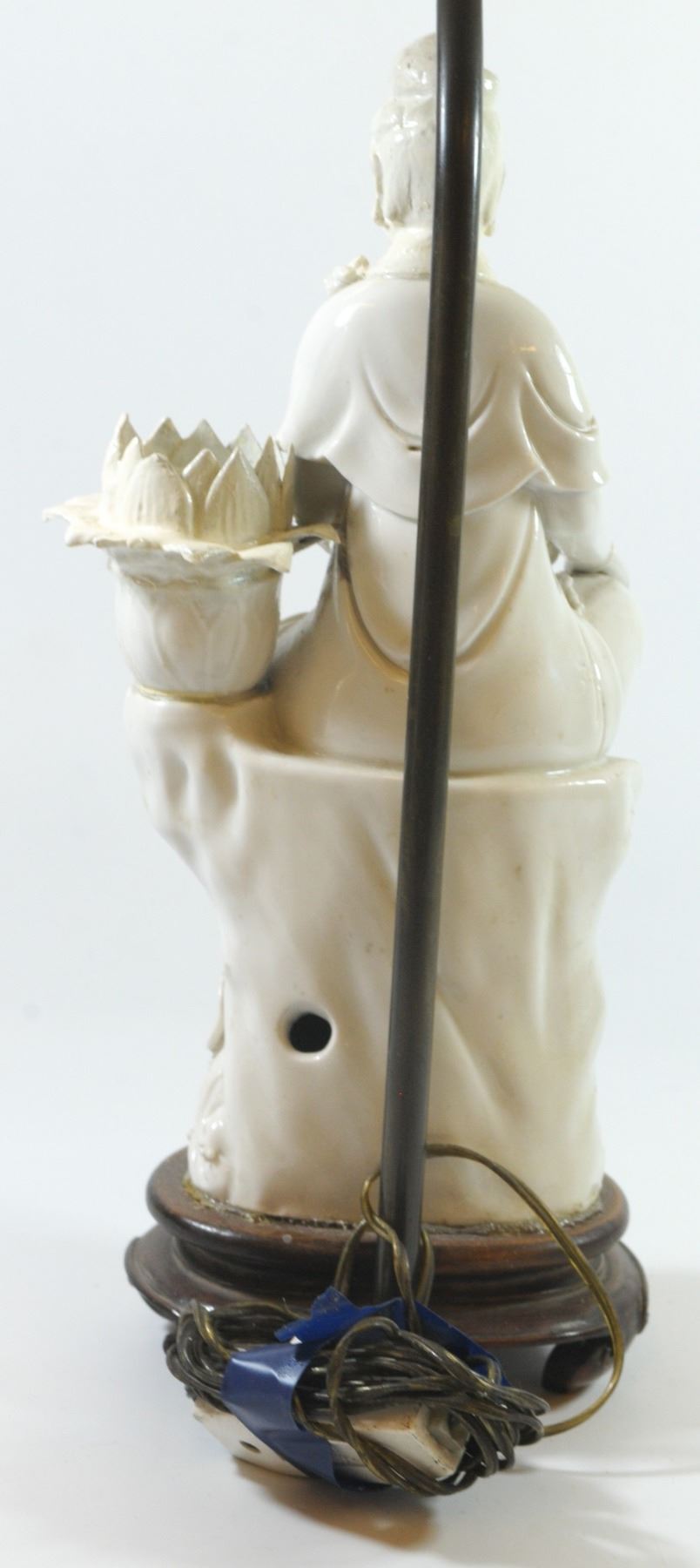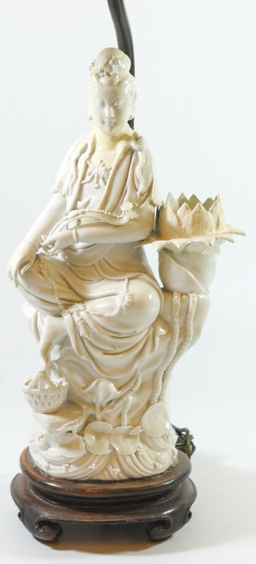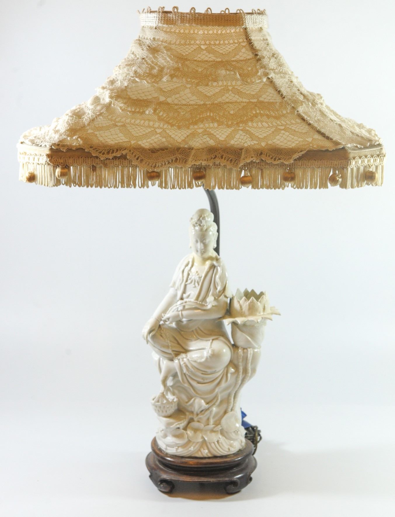 Old Chinese Blanc de Chine figurine - desk lamp base mounted on matching wooden base, includes (old) electric wire and colorful matching lampshade, old repaires: head and left hand and flower petals have been repaired, height: 51 cm.