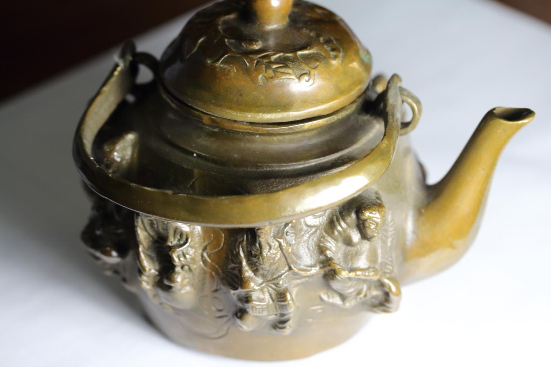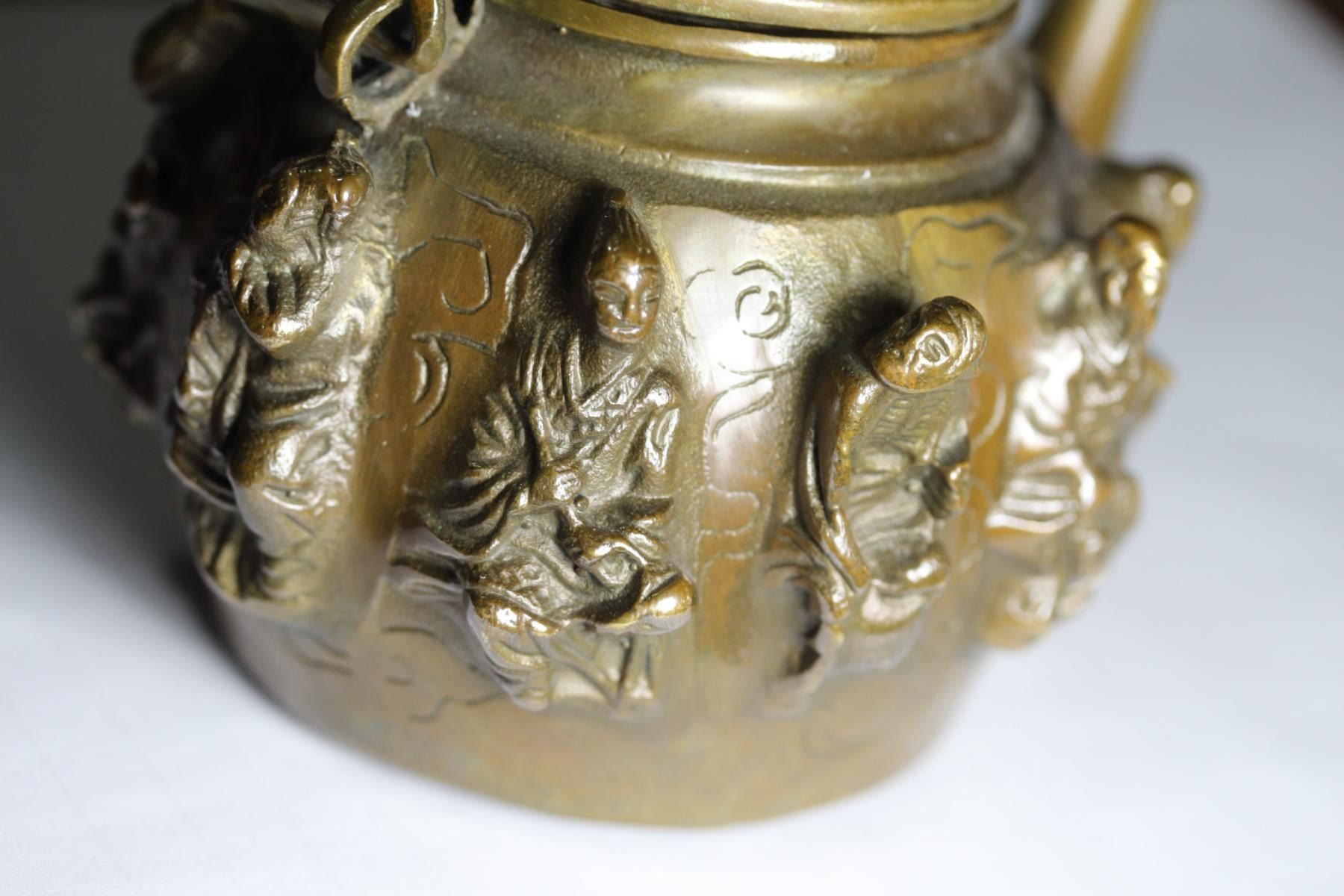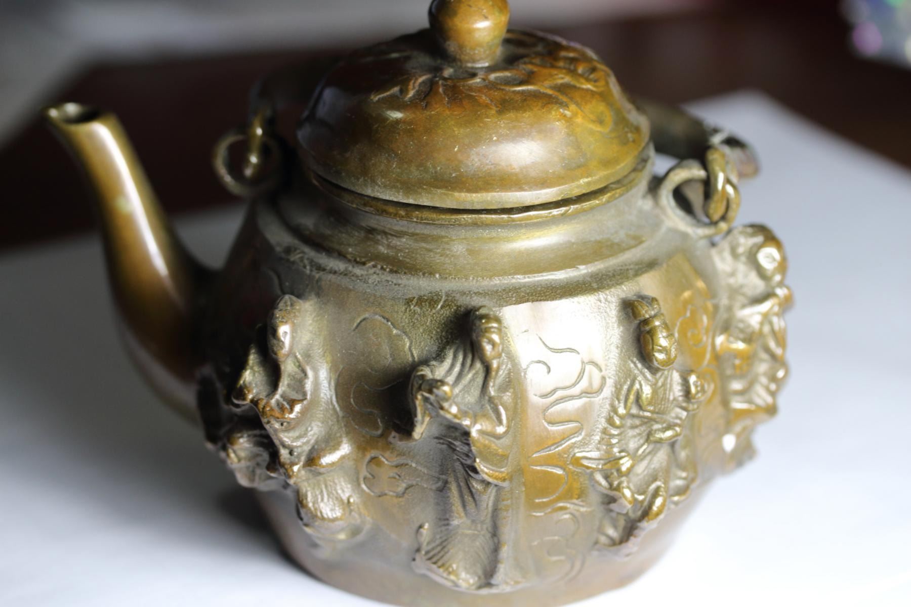Old-Chinese-Brass Eight-Immortals-8-God-statue- Kettle.....wine pot;size Long: 140 mm/5.51 inch Width: 110 mm/4.33 inch High: 140 mm/5.51 inch weight? 600g