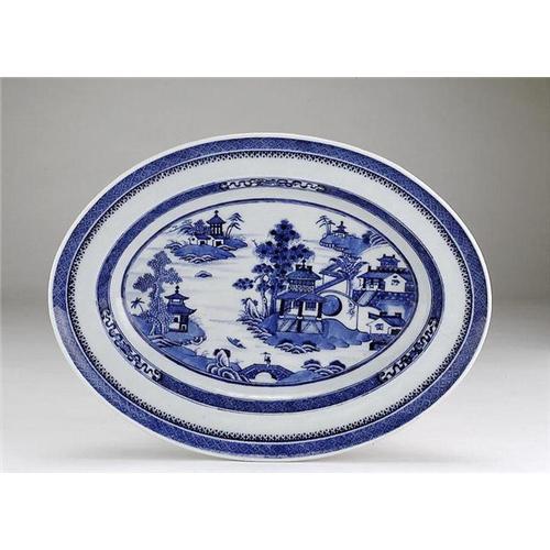 Old (1920s) Chinese Export Blue White Nanking Platter  <p>     The platter is 1.5 inches tall, and 12.8 inches by 9.75 inches wide. </p><p>  It is in good condition with no repairs, chips, nor cracks.</p></p>