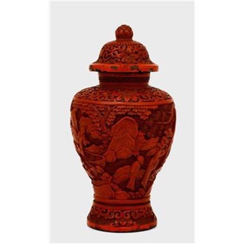 Old (1930's) Chinese Export Cinnabar Covered Vase with Figurines