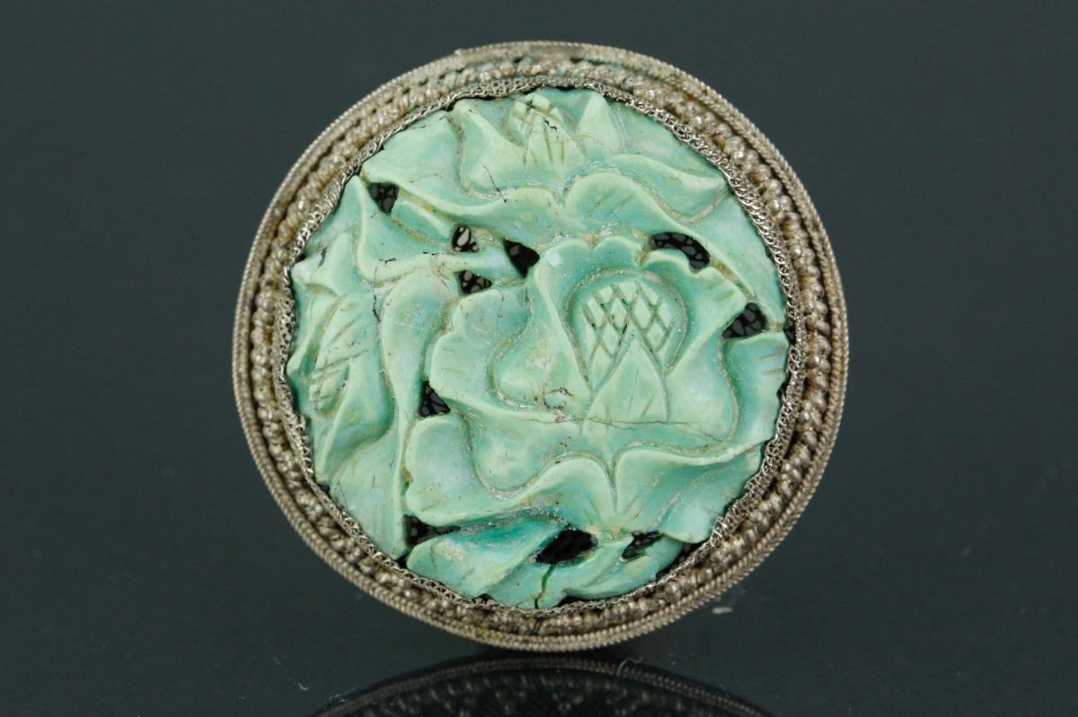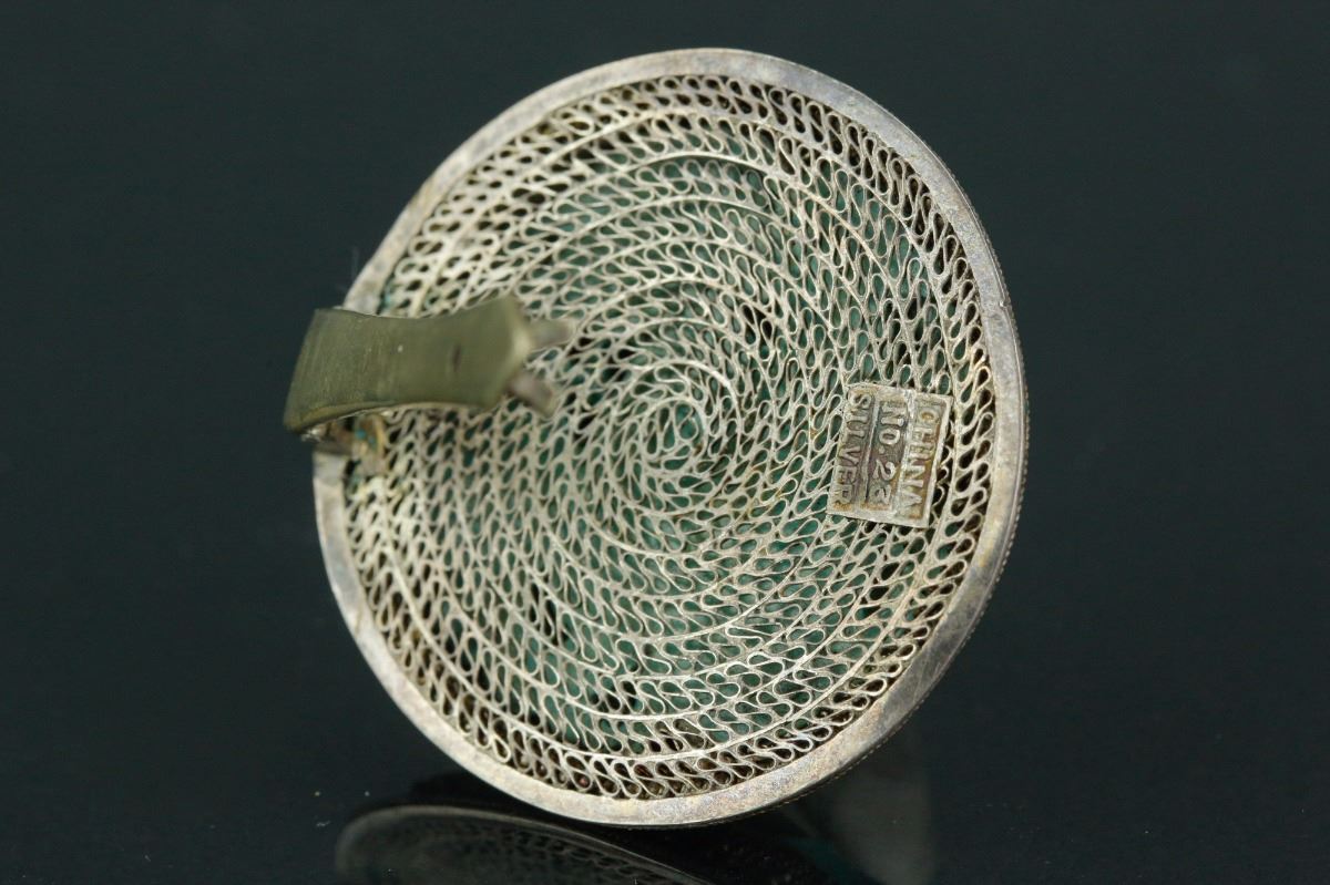 Chinese old turquoise brooch; featuring openwork carved flower with silver filigree frame; CHINA NO.23 SILVER mark on back; D: 4 cm 14 grams