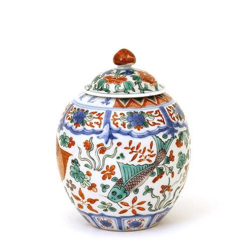 Old (1910's) Chinese Wucai Covered Jar w Koi Fish Wanli Style