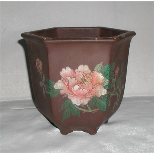 Very nicely potted Antique Chinese yixing purple clay enamel bonsai flower pot in fine condition. 7 1/2 inches tall, with 9 inches across.