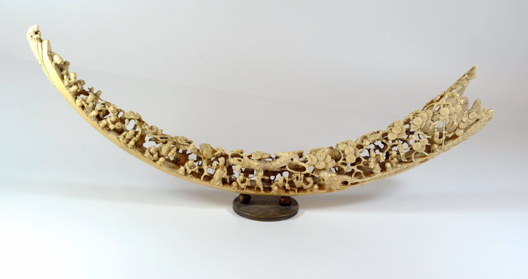 Old Chinese quality carved Ivory tooth, appears to be from the 18th century, quality hand-carving of rural everyday figures and bonsai trees, flaws: mostly in thicker part of tooth: a number of missing embellishments. Mounted on bronze base (later addition), length: 53 cm.