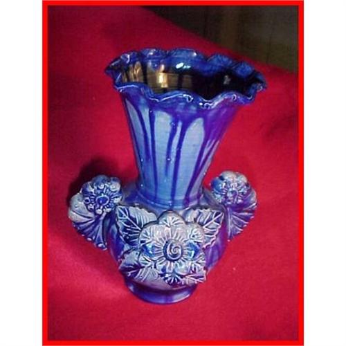 This 7" unsigned Mexican Folk Art pottery vase has applied decorative handles with applied floral decoration. Made of buff colored earthenware with a cobalt lead glaze. Good condition with typical flaws in handmade Folk Pottery of uneven glazing, production molding flaws, and some scuffing. No major damage! Unusual and rare coloring and decoration. Exact age is unknown. I bought this at a South Dakota shop that bought this at an estate sale.