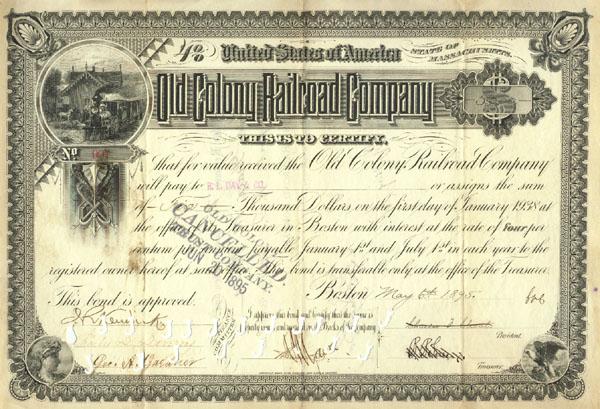 1895. Massachusetts. Stock certificate for 5000 shares. Black/White. Vignette of passenger train in station in upper left, female head in lower left, and eagle in lower right. Pen and punch cancelled. Very fine.