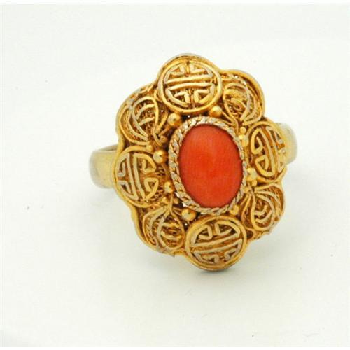 Very old Chinese Key Ring with a 5 x 8 mm Coral Cabochon that stick up high from the dome setting. The setting is 20mm long and 16mm wide and with the stone sticks up 11mm from the band. The setting is vermeil sterling ( gold gild). The band is a size 7. As you can see by the pictures that dome compromises a series of Chinese Key overlay design with some other design between each of the keys. I don't know if the other design is symbolic or free form. <p> The condition of the stone is excellent. The ring has a bit of wear to the vermeil surface on the band. The face of the ring is fine.
