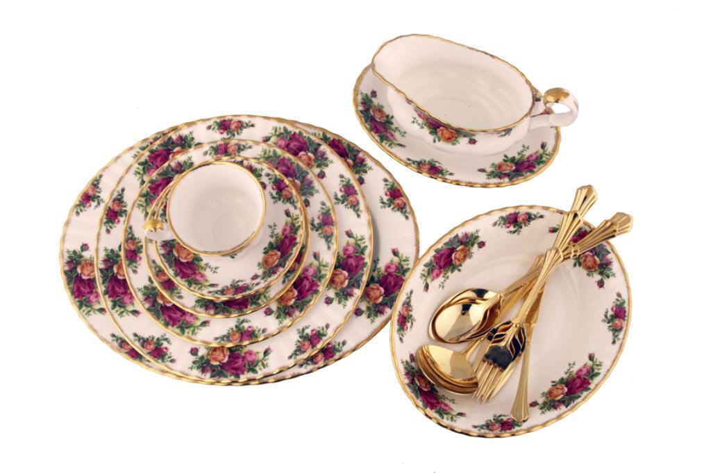 Old Country Roses Dinnerware Royal Albert Old Country Roses bone china, one of the most cherished china patterns of all time, hand washed from J C Penny's, includes 6 salad plates, 6 dessert plates, 6 saucers, salt & Pepper, 6 cups, gravy boat, serving platter, 2 serving bowls, and 6 dinner plates. Retail: $820.00, also includes a service for 6 gold Estia silverware with two serving spoons, a gravy spoon, a serving fork, and a butter knife, all in a wooden case.