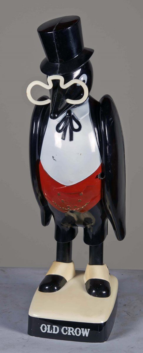 Hollow hard plastic crow on attached base. Wearing glasses and top hat, front of cane is missing. Condition (Very Good). Size 32" T.
