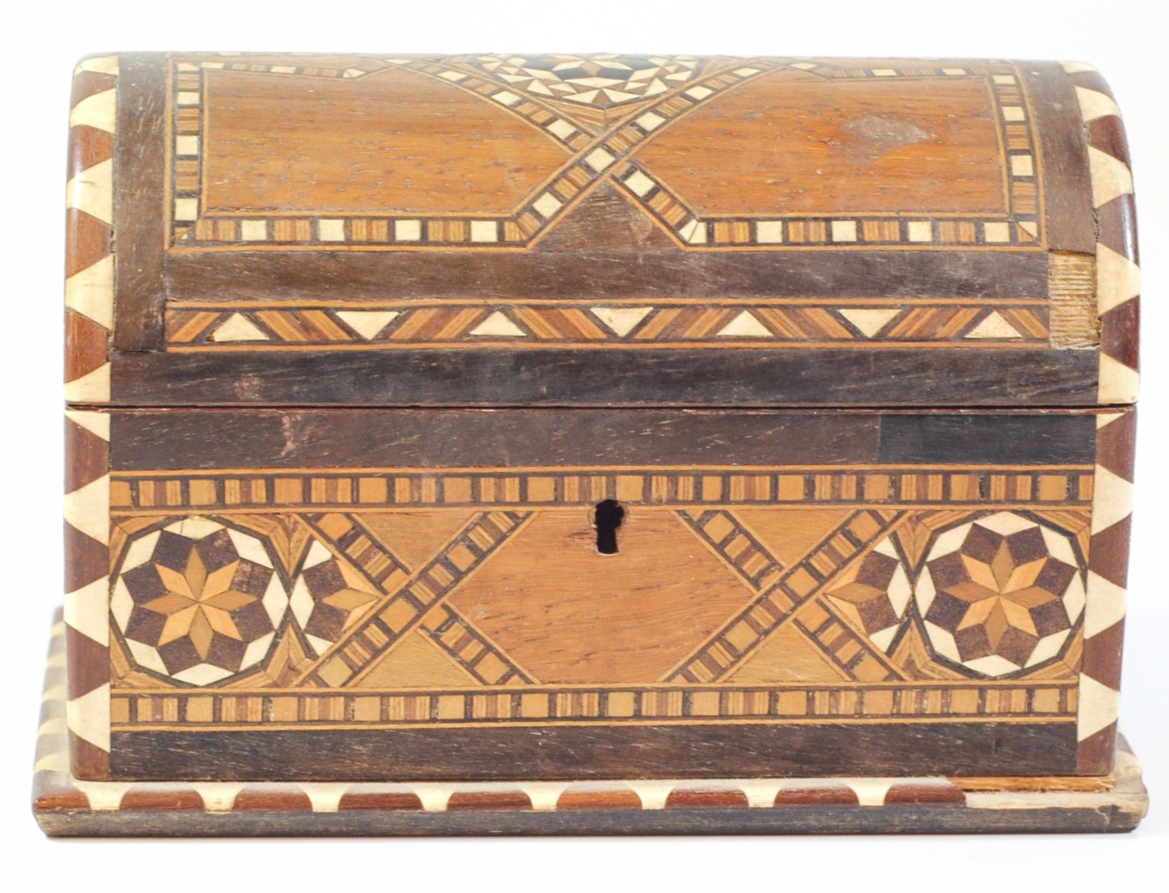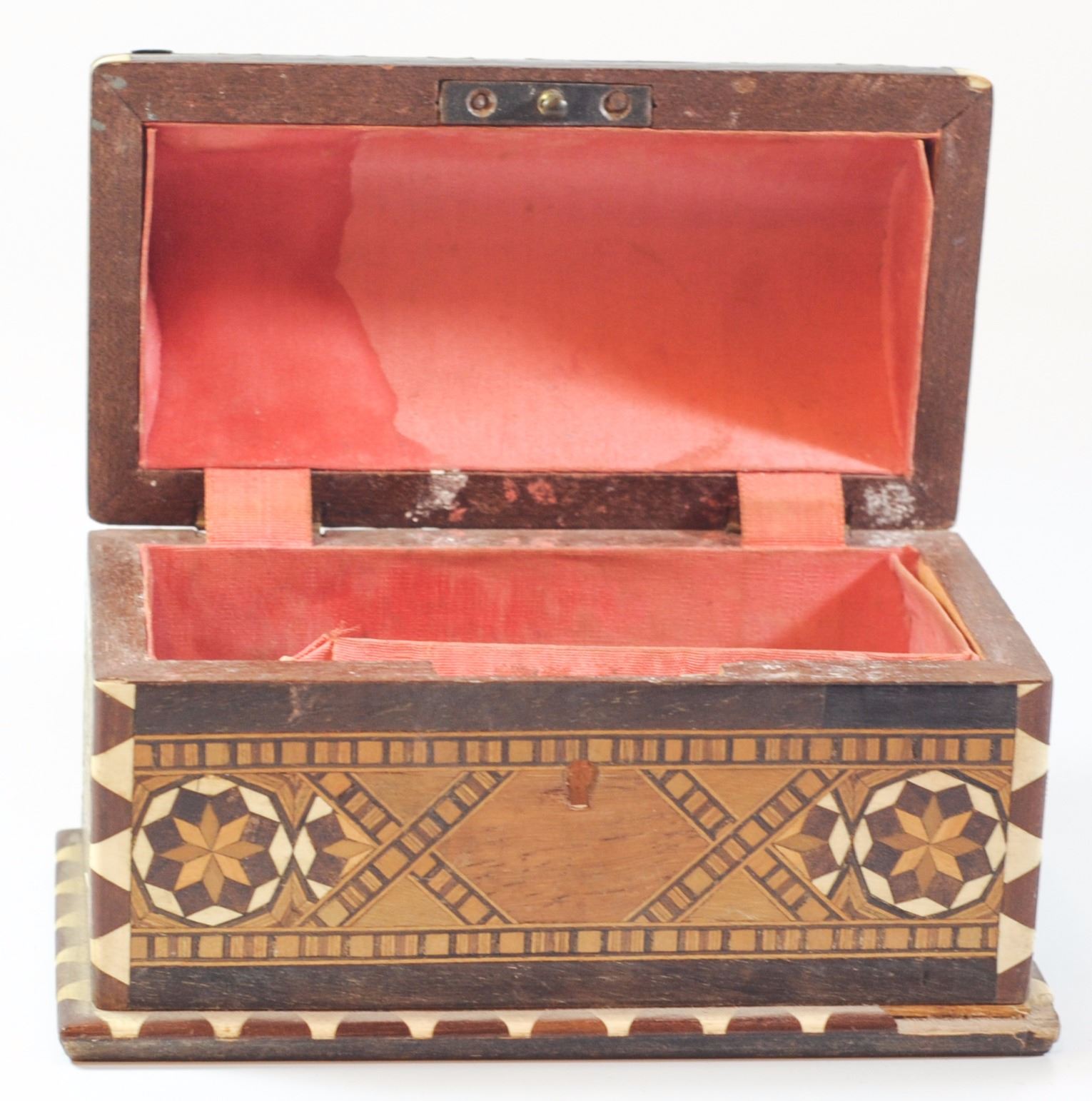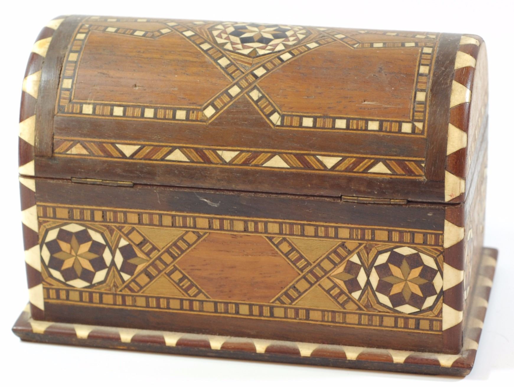 Old chest-shaped Damascene box, wood and seashell settings, inner pink velvet coating, missing lock, slight flaws: piece missing from right corner of base and one of the lid's settings is missing. Dimensions: 14X8.5X10 cm.