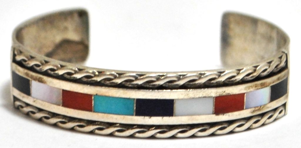 Old Dead Pawn Multi-Stone Inlay Sterling Silver Small Cuff Bracelet