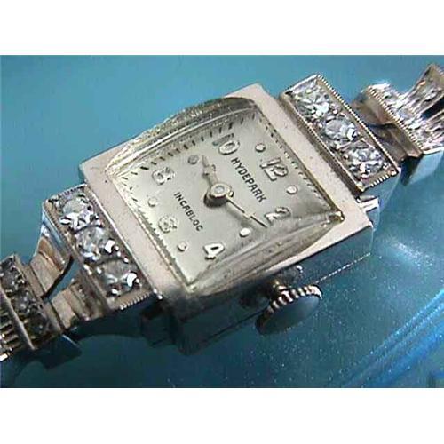 Outstanding Art Deco 14kt White Gold & Diamond Lay's Hydepark Wristwatch; with fancy diamond set hour glass lugs and flexible double strand slinky form band, and safety catch lock, convex dome crystal face silver tone dial, Arabic numeral and circular hour markers and matching silver tone hands. This elegant timepiece would make a spectacular gift for that special someone. Size: 18mm x14 mm (case size), 6.5" (band Length)Weight: 22 grams.