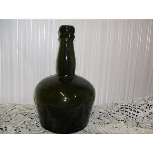 Short Plump Deep Emerald Green Glass Bottle with Blob top. Large X marked on bottom. Half moon inscribed on upper front. Excellent condition.