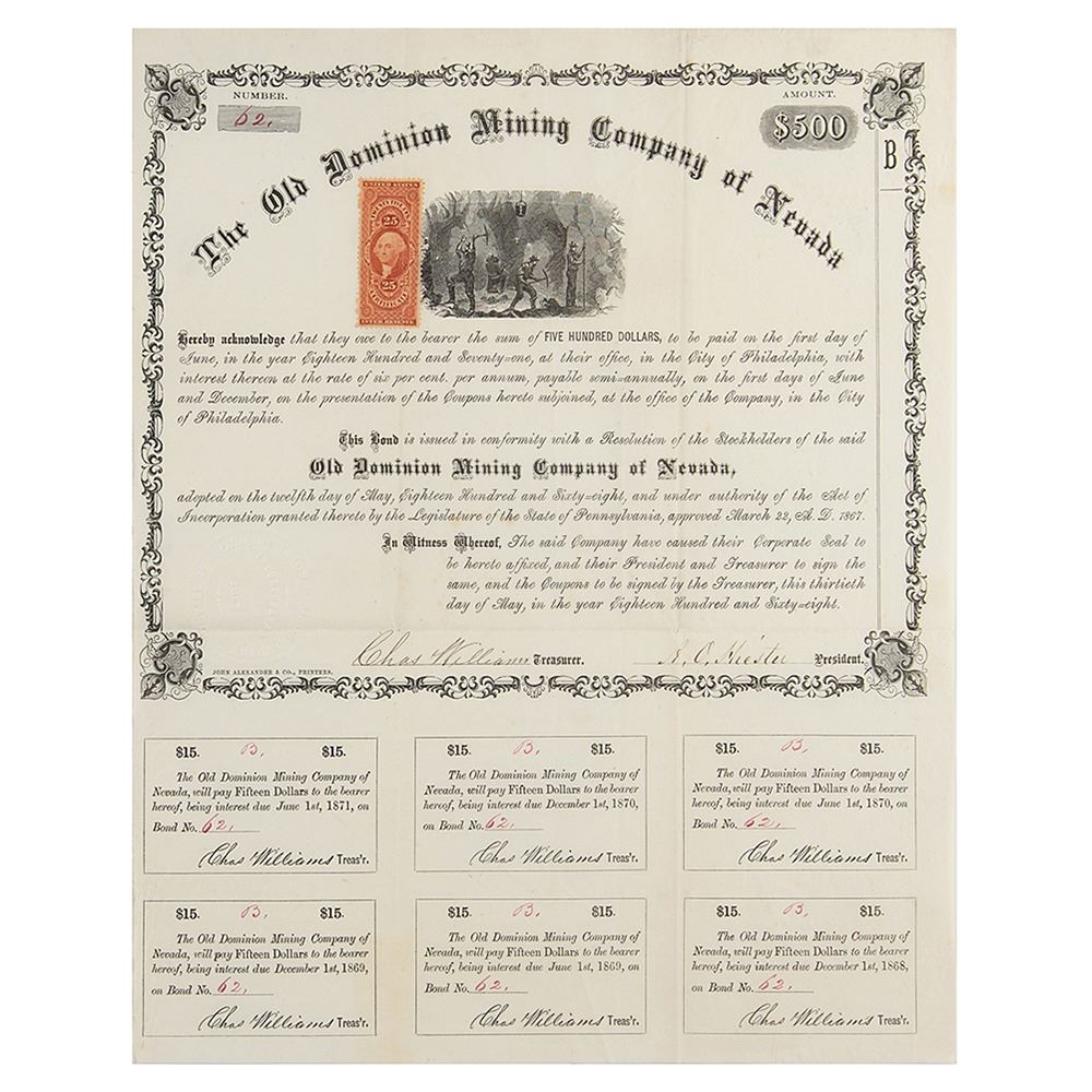Attractive $500 bond of the Old Dominion Mining Company of Nevada issued May 30, 1868, 11 x 13.5, with six coupons intact below. The bond carries a rate of 6% and boasts a fine vignette of a classic mining scene. In fine condition.