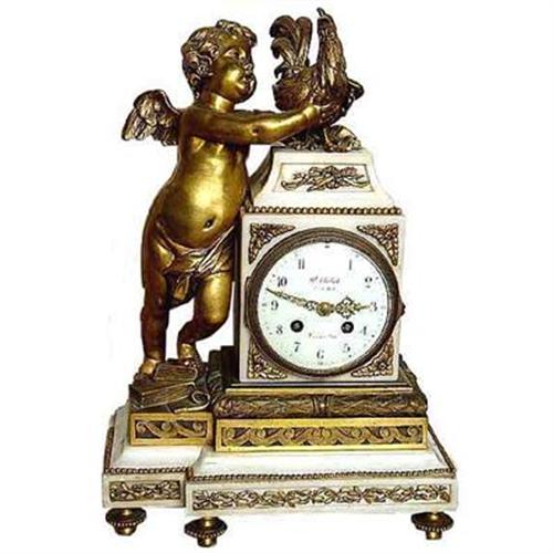Indistinguishably signed on the dial, place of origin; Versailles, with a detailed winged angel standing on books to grasp the perched rooster, recess accented with bow and arrow motif ormolu mount tapering to a beaded bronze trim and ormolu mount flower form corner frets. The clock case housing the two train movement chimes on the half hour and on the hour, has a white enamel dial, Roman numeral hour markers fancy gold tone open work hands, is mounted on a cushion of acanthus leaves resting on a wave-form bronze base itself mounted on a recessed marble plinth adorned with beaded bronze trim and recessed acanthus leaf ormolu mounts, raised on six round pad feet.