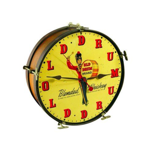 Old Drum Brand of Blended Whiskey Sign in the shape of a snare drum. Tin and Wood. Made by the MacLaren Action sign Company, Evansville, IN. A few minor scratches, otherwise excellent condition. 12 inch diameter.