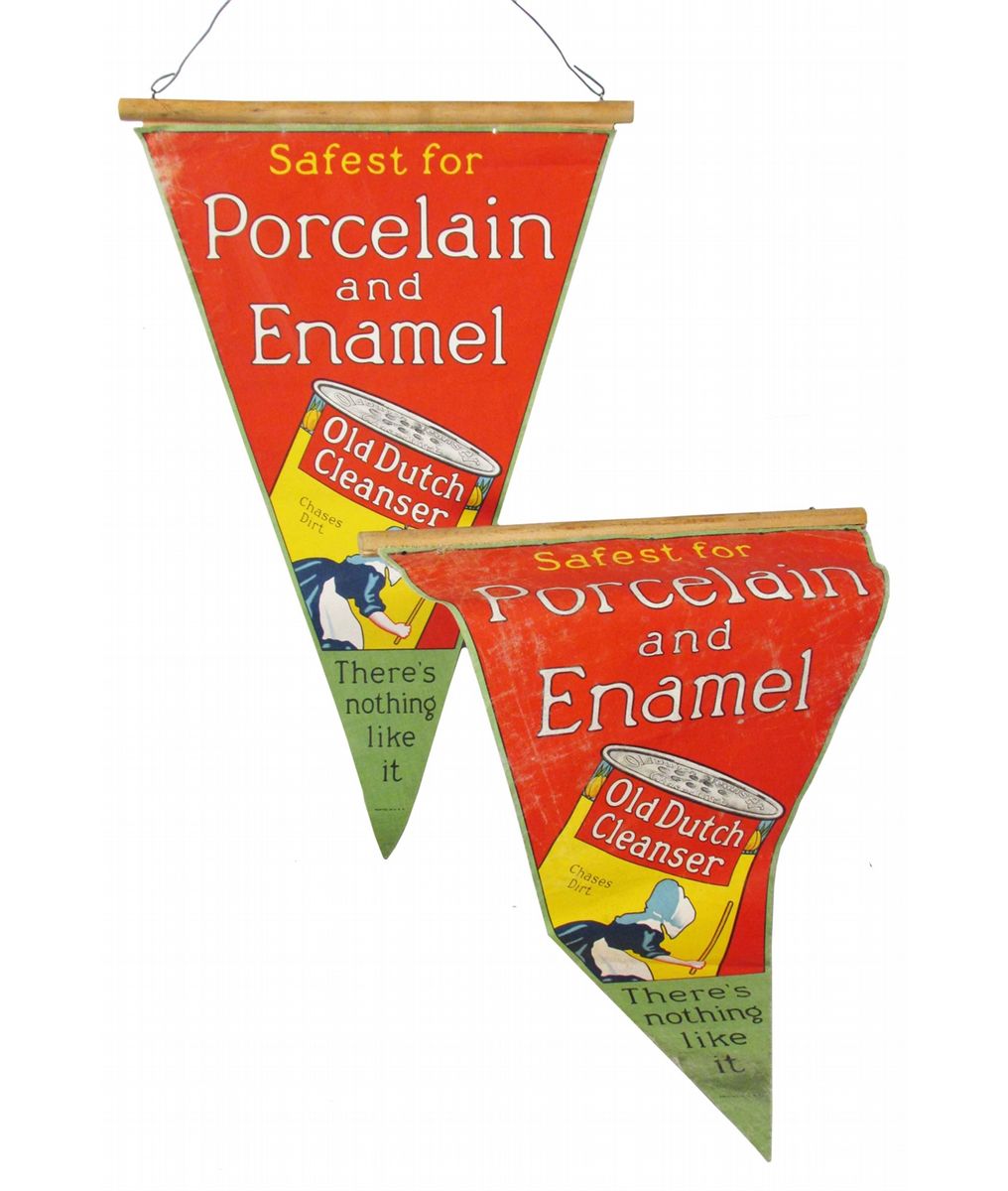 2 Old Dutch Cleaner Linen Advertising Banners. Some surface wear otherwise good condition. 16 3/4 inches X 26 inches.