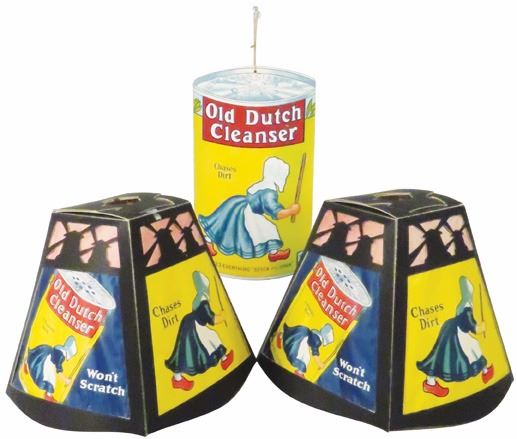 Old Dutch Cleanser Advertising Items. Die cut cardboard fan pull and paper lanterns. Mint to near mint condition. Fan pull measures 5 X 9 inches.