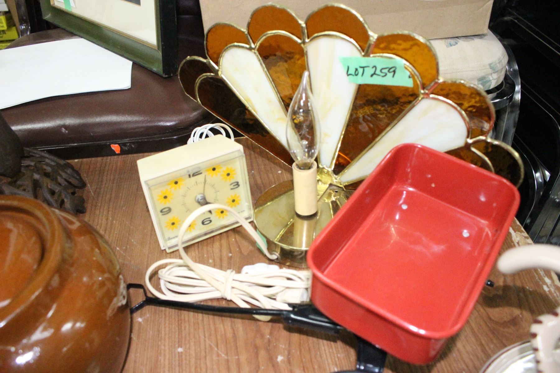 Old Electric Clock; Stained Glass Fan Light and a Red Toy Wagon