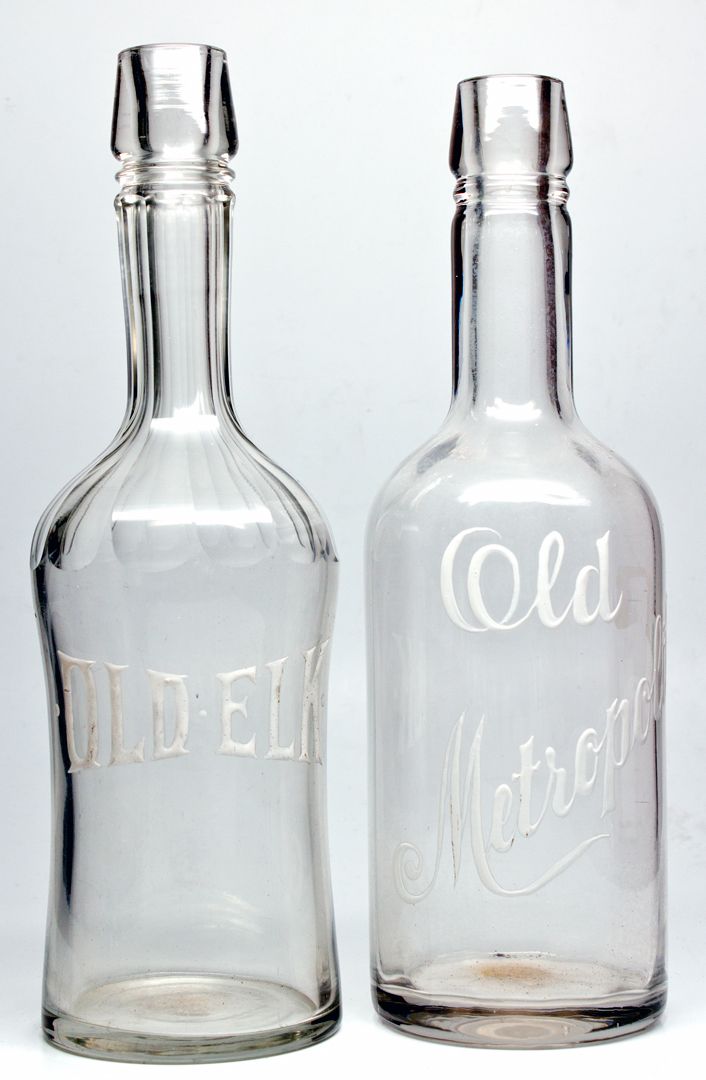 This lot contains two back bar bottles from the 1890s. They are made of clear glass. The one marked "OLD METROPOLITAN" in white enamel lettering stands about 11" tall and has a single collar un-ground applied top. There is no chipping or cracks. The second bottle stands over 11" and is labeled "OLD ELK" in white enamel. This bottle has a double collar applied un-ground top, with no cracking or chipping evident.