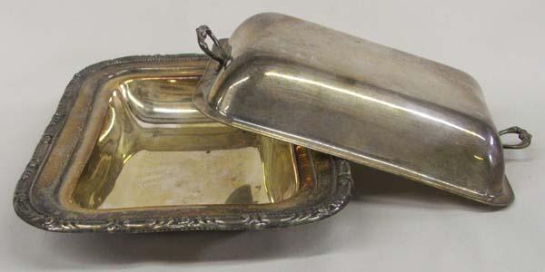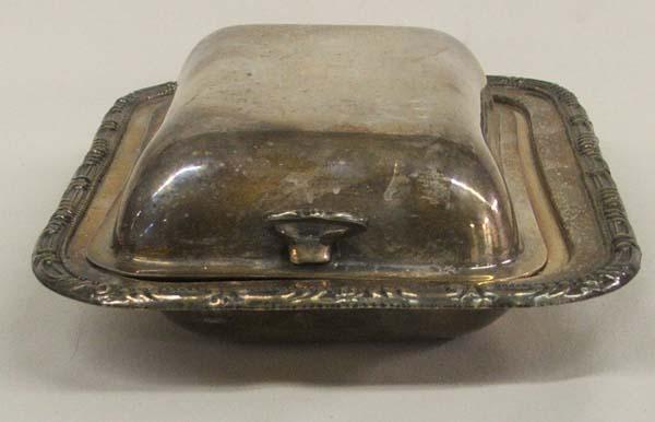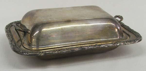 Old English Reproduction Silverplate Butter Dish. Has stamped on back: Old English Reproduction, 42. Measures approx. 3''H x 9''L x 6 3/4''W. Buyers Pay Actual Shipping and Handling Charges(see terms and conditions for more information).
