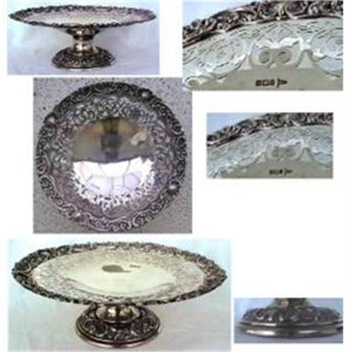 Fabulous Tazza or comport - Sterling Silver - made in Sheffield, England by Walker and Hall in 1903. Measures 11" in Diam; 4" high and weighs 23 1/2 oz. Very good, quality center piece. Round foot covered in repousse scrolls & foliage. Leads to a convex neck from which flares the bowl of the comort. The sides of the bowl have a wide band of open pierced work - again foliage and scrolling patterns. Around this is a border of repousse work, similair to that on the foot with flowers inside scrolls, intersperced with fan-shaped shells. marks :the inside of the bowl is clearly hallmarked with the Crown (Sheffield); Lion Passant (Sterling Silver); "L" date mark for 1903; and makers mark W&H in a flag. Underneath the foot is the same flag -slightly bigger with 51850 Walker and Hall, Sheffield, England 27. condition : Excellent condition. No dents/dings Please contact me fpr price via directly.