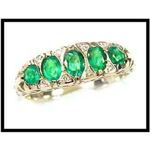 Great workmanship in 14K gold creates an attractive ring in the style of English Victorian Jewels. Size 7 3/4 is easy change. 5 natural emeralds with 8 diamond accents. Excellent condition. Was priced for $700.