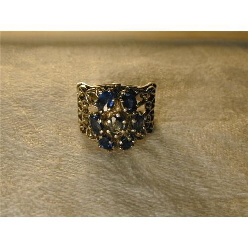 You are looking at a gorgeous 14K white gold filigree ring with sapphires. There are 7 genuine spphires. The top of the ring measures 5/8 of an inch long by .50 an inch wide. Each sapphire measures 4 mm by 5 mm. It is a size 5.5. Sizing is available. This ring weighs 7 grams.